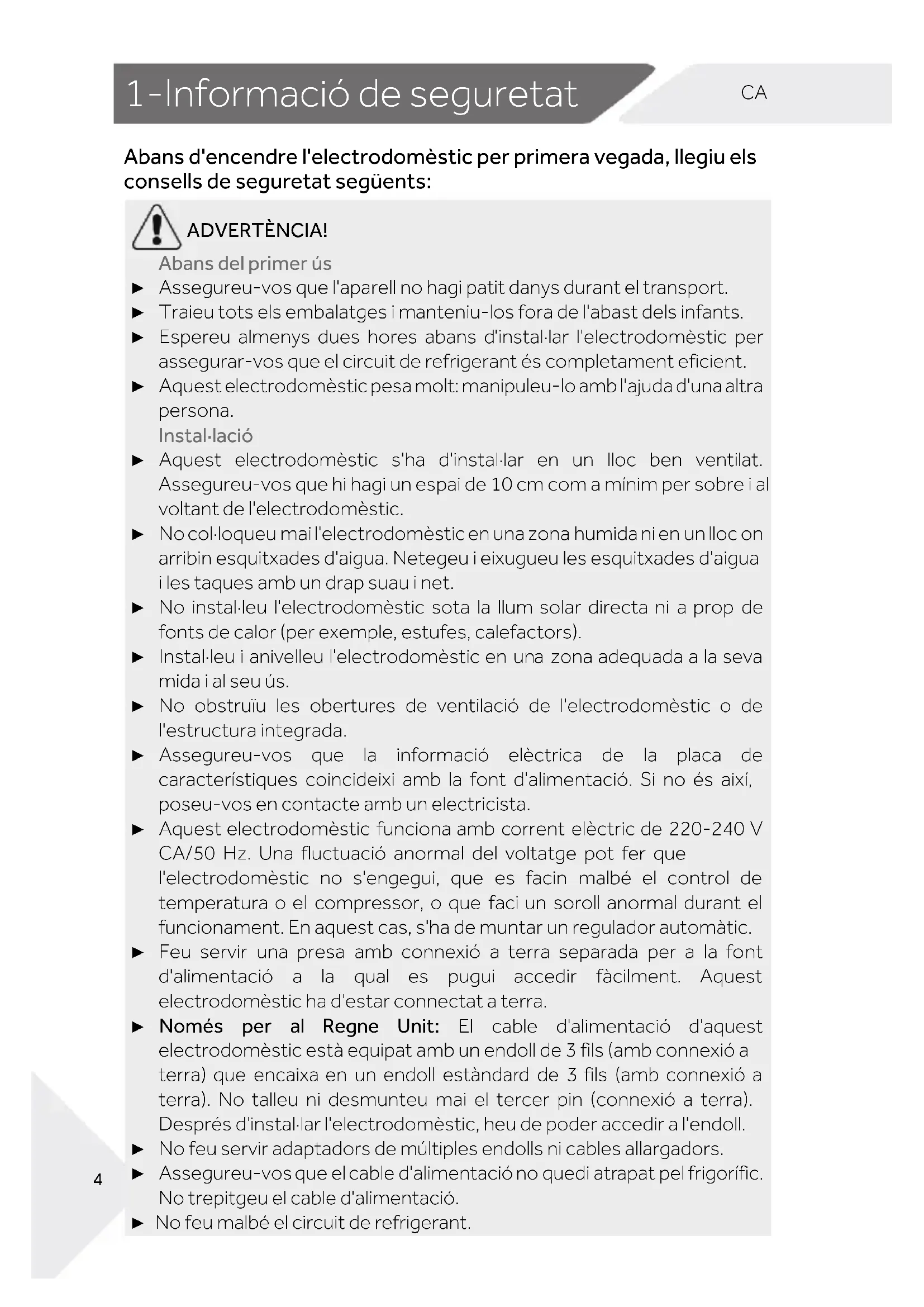 1-Informació de seguretat Abans d'encendre l'electrodomèstic per primera vegada, llegiu els consells de seguretat següents: ADVERTÈNCIA! Abans del primer ús ► Assegureu-vos que l'aparell no hagi patit danys durant el transport. ► Traieu tots els embalatges i manteniu-los fora de l'abast dels infants. ► Espereu almenys dues hores abans d'instal·lar l'electrodomèstic per assegurar-vos que el circuit de refrigerant és completament eficient. ► Aquest electrodomèstic pesa molt: manipuleu-lo amb l'ajuda d'una altra persona. Instal·lació ► Aquest electrodomèstic s'ha d'instal·lar en un lloc ben ventilat. Assegureu-vos que hi hagi un espai de 10 cm com a mínim per sobre i al voltant de l'electrodomèstic. ► No col·loqueu mai l'electrodomèstic en una zona humida ni en un lloc on arribin esquitxades d'aigua. Netegeu i eixugueu les esquitxades d'aigua i les taques amb un drap suau i net. ► No instal·leu l'electrodomèstic sota la llum solar directa ni a prop de fonts de calor (per exemple, estufes, calefactors). ► Instal·leu i anivelleu l'electrodomèstic en una zona adequada a la seva mida i al seu ús. ► No obstruïu les obertures de ventilació de l'electrodomèstic o de l'estructura integrada. ► Assegureu-vos que la informació elèctrica de la placa de característiques coincideixi amb la font d'alimentació. Si no és així, poseu-vos en contacte amb un electricista. ► Aquest electrodomèstic funciona amb corrent elèctric de 220-240 V CA/50 Hz. Una fluctuació anormal del voltatge pot fer que l'electrodomèstic no s'engegui, que es facin malbé el control de temperatura o el compressor, o que faci un soroll anormal durant el funcionament. En aquest cas, s'ha de muntar un regulador automàtic. ► Feu servir una presa amb connexió a terra separada per a la font d'alimentació a la qual es pugui accedir fàcilment. Aquest electrodomèstic ha d'estar connectat a terra. ► Només per al Regne Unit: El cable d'alimentació d'aquest electrodomèstic està equipat amb un endoll de 3 fils (amb connexió a terra) que encaixa en un endoll estàndard de 3 fils (amb connexió a terra). No talleu ni desmunteu mai el tercer pin (connexió a terra). Després d'instal·lar l'electrodomèstic, heu de poder accedir a l'endoll. ► No feu servir adaptadors de múltiples endolls ni cables allargadors. ► Assegureu-vos que el cable d'alimentació no quedi atrapat pel frigorífic. No trepitgeu el cable d'alimentació. ► No feu malbé el circuit de refrigerant.1-Informació de seguretat