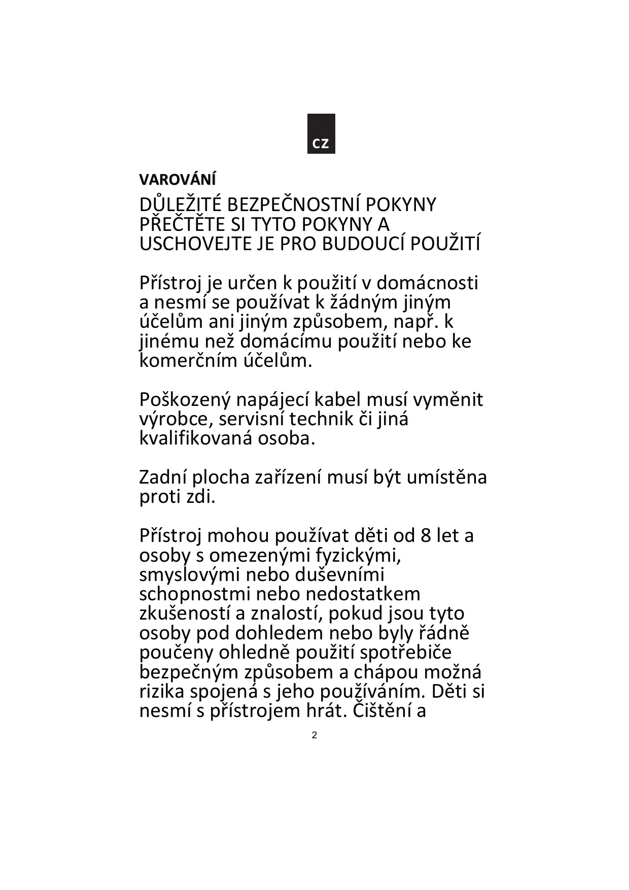 Přístroj je určen k použití v domácnosti a nesmí se používat k žádným jiným účelům ani jiným způsobem, např. k jinému než domácímu použití nebo ke komerčním účelům. Poškozený napájecí kabel musí vyměnit výrobce, servisní technik či jiná kvalifikovaná osoba. Zadní plocha zařízení musí být umístěna proti zdi. Přístroj mohou používat děti od 8 let a osoby s omezenými fyzickými, smyslovými nebo duševními schopnostmi nebo nedostatkem zkušeností a znalostí, pokud jsou tyto osoby pod dohledem nebo byly řádně poučeny ohledně použití spotřebiče bezpečným způsobem a chápou možná rizika spojená s jeho používáním. Děti si nesmí s přístrojem hrát. Čištění a