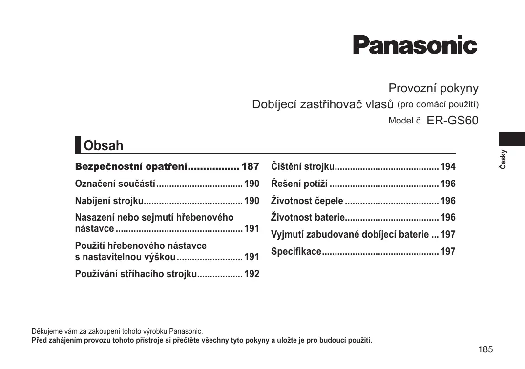 Téléchargez la notice de votre Strojek na vlasy au format PDF gratuitement ! Retrouvez votre notice ER-GS60 - PANASONIC et reprennez votre appareil électronique en main. Sur cette page sont publiés tous les documents nécessaires à l'utilisation de votre appareil ER-GS60 de la marque PANASONIC.