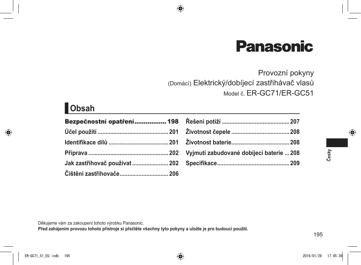 Provozní pokyny (Domácí) Elektrický/dobíjecí zastřihávač vlasů Model č. ER‑GC71/ER‑GC51 Bezpečnostní opatření 198