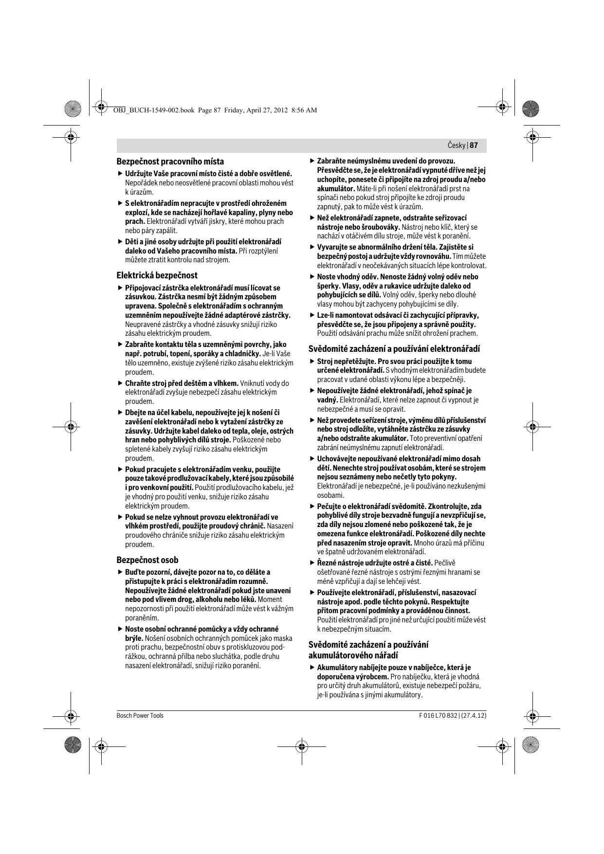 m/s2 m/s2 2,5 1,5 4,0 1,5 Pro přesný odhad zatížení vibracemi by měly být zohledněny i doby, v nichž je stroj vypnutý nebo sice běží, ale fakticky není nasazen. To může zatíženi vibracemi po celou pracovní dobu zřetelně zredukovat. Stanovte dodatečná bezpečnostní opatření k ochraně obsluhy před účinky vibrací jako např.: údržba elektronářadí a nasazovacích nástrojů, udržování teplých rukou, organizace pracovních procesů. Prohlášení o shodě Prohlašujeme ve výhradní zodpovědnosti, že v odstavci „Technická data“ popsaný výrobek je v souladu s následujícími normami nebo normativními dokumenty: EN 60745 podle ustanovení směrnic 2011/65/EU, 2004/108/ES, 2006/42/ES, 2000/14/ES. 2000/14/ES: zaručená hladina akustického výkonu Metoda posouzení shody podle dodatku V. F 016 L70 832 | (27.4.12)