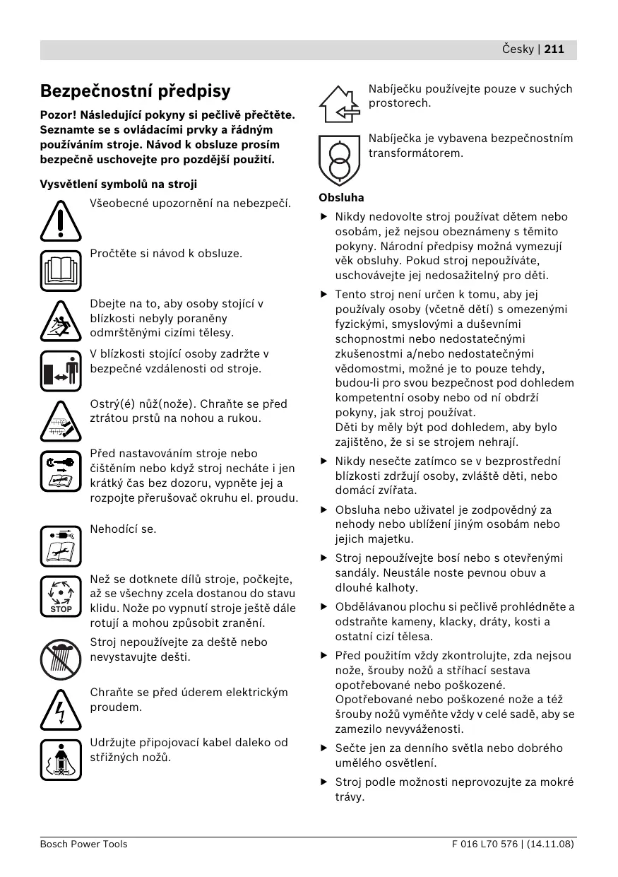 Pozor! Následující pokyny si pečlivě přečtěte. Seznamte se s ovládacími prvky a řádným používáním stroje. Návod k obsluze prosím bezpečně uschovejte pro pozdější použití. Nabíječka je vybavena bezpečnostním transformátorem. Vysvětlení symbolů na stroji Všeobecné upozornění na nebezpečí. Pročtěte si návod k obsluze. Dbejte na to, aby osoby stojící v blízkosti nebyly poraněny odmrštěnými cizími tělesy. V blízkosti stojící osoby zadržte v bezpečné vzdálenosti od stroje. Ostrý(é) nůž(nože). Chraňte se před ztrátou prstů na nohou a rukou. Před nastavováním stroje nebo čištěním nebo když stroj necháte i jen krátký čas bez dozoru, vypněte jej a rozpojte přerušovač okruhu el. proudu. Nehodící se. STOP Než se dotknete dílů stroje, počkejte, až se všechny zcela dostanou do stavu klidu. Nože po vypnutí stroje ještě dále rotují a mohou způsobit zranění. Stroj nepoužívejte za deště nebo nevystavujte dešti. Chraňte se před úderem elektrickým proudem. Udržujte připojovací kabel daleko od střižných nožů. Obsluha f Nikdy nedovolte stroj používat dětem nebo osobám, jež nejsou obeznámeny s těmito pokyny. Národní předpisy možná vymezují věk obsluhy. Pokud stroj nepoužíváte, uschovávejte jej nedosažitelný pro děti. f Tento stroj není určen k tomu, aby jej používaly osoby (včetně dětí) s omezenými fyzickými, smyslovými a duševními schopnostmi nebo nedostatečnými zkušenostmi a/nebo nedostatečnými vědomostmi, možné je to pouze tehdy, budou-li pro svou bezpečnost pod dohledem kompetentní osoby nebo od ní obdrží pokyny, jak stroj používat. Děti by měly být pod dohledem, aby bylo zajištěno, že si se strojem nehrají. f Nikdy nesečte zatímco se v bezprostřední blízkosti zdržují osoby, zvláště děti, nebo domácí zvířata. f Obsluha nebo uživatel je zodpovědný za nehody nebo ublížení jiným osobám nebo jejich majetku. f Stroj nepoužívejte bosí nebo s otevřenými sandály. Neustále noste pevnou obuv a dlouhé kalhoty. f Obdělávanou plochu si pečlivě prohlédněte a odstraňte kameny, klacky, dráty, kosti a ostatní cizí tělesa. f Před použitím vždy zkontrolujte, zda nejsou nože, šrouby nožů a stříhací sestava opotřebované nebo poškozené. Opotřebované nebo poškozené nože a též šrouby nožů vyměňte vždy v celé sadě, aby se zamezilo nevyváženosti. f Sečte jen za denního světla nebo dobrého umělého osvětlení. f Stroj podle možnosti neprovozujte za mokré trávy. Bosch Power Tools F 016 L70 576 | (14.11.08) 212 | Česky f Nikdy neprovozujte stroj s vadnými ochrannými přípravky, kryty nebo bezpečnostními zařízeními, jako např. s vadnou ochranou proti odmrštění a/nebo vadným sběrným košem na trávu. – když stroj kontrolujete, čistíte nebo na něm pracujete, – po kolizi s cizím tělesem. Stroj okamžitě zkontrolujte na poškození a nechte jej, je-li to nutné, opravit, – když stroj začne nezvykle vibrovat (okamžitě zkontrolovat). f Práce na svazích může být nebezpečná. Údržba f Neustále choďte klidně, nikdy rychle neběhejte. – Nesečte žádné obzvlášť příkré stráně. – Na skloněných plochách nebo na mokré trávě dbejte neustále na bezpečnou stopu. – Na skloněných plochách sečte vždy napříč a nikdy směrem nahoru a dolů. – Při změně směru na svazích si počínejte nanejvýš opatrně. f Při chůzi pozpátku nebo při tažení stroje si počínejte nanejvýš opatrně. f Stroj posunujte při sečení vždy kupředu a nikdy ho netáhněte k tělu. f Nože musejí stát, když musíte stroj pro přepravu naklopit, když přetínáte plochy neosazené trávou a když stroj přepravujete k a od sečené oblasti. f Stroj při zapnutí nebo rozběhu motoru nenaklánějte, ledaže by to bylo potřeba ke startu ve vysoké trávě. V tom případě nadzdvihněte jen tolik, jak je nezbytně nutné, od obsluhy odvrácenou stranu stlačením rukojeti dolů. Dbejte na to, aby se Vaše ruce nacházely na rukojeti, když stroj opět spouštíte dolů. f Stroj zapněte jak je popsáno v návodu k provozu a dbejte na to, aby byly Vaše nohy vzdáleny dostatečně daleko od rotujících dílů. f Nedávejte své ruce a nohy do blízkosti nebo pod rotující díly. f Když pracujete se strojem, udržujte odstup vůči chrlící zóně. f Nikdy nezvedejte resp. nenoste stroj s běžícím motorem. Přerušovač okruhu el. proudu rozpojte: – vždy, když se od stroje vzdálíte, – před odstraněním zablokování, F 016 L70 576 | (14.11.08) f Zajistěte pevné dosednutí všech matic, čepů a šroubů, tím je zaručen bezpečný pracovní stav stroje. f Pravidelně kontrolujte stav a opotřebení sběrného koše na trávu. f Stroj kontrolujte a opotřebované nebo poškozené díly pro jistotu nahraďte. f Používejte výhradně pro stroj určené střižné nože. f Zajistěte, aby vyměněné díly pocházely od firmy Bosch. f Když manipulujete nebo pracujete v oblasti ostrých nožů, vždy noste zahradní rukavice. Upozornění pro optimální zacházení s akumulátorem f Dříve než nasadíte akumulátor, zajistěte, aby byl stroj vypnutý. Nasazení akumulátoru do stroje, který je zapnutý, může vést k úrazům. f Chraňte nabíječku před deštěm a vlhkem. Vniknutí vody do nabíječky zvyšuje riziko úrazu elektrickým proudem. f Akumulátory nabíjejte pouze v nabíječkách, jež jsou doporučeny výrobcem. Pro nabíječku, která je vhodná pro určitý druh akumulátorů, existuje nebezpečí požáru, je-li používána s jinými akumulátory. f Nenabíjejte žádné cizí akumulátory. Nabíječka je vhodná pouze k nabíjení akumulátorů Li-ion firmy Bosch s napětími uvedenými v technických datech. Jinak existuje nebezpečí požáru a výbuchu. f Udržujte nabíječku čistou. Zneči