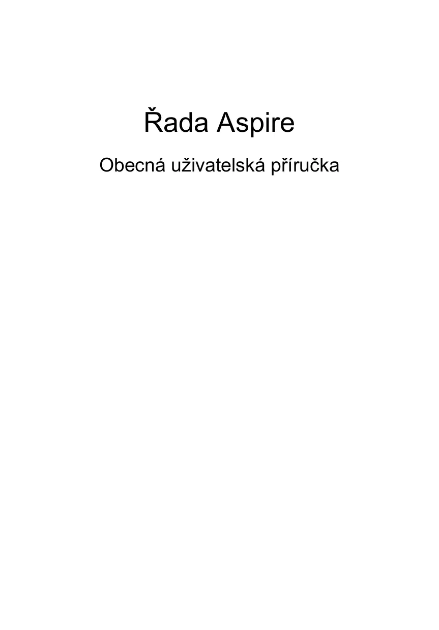 Řada Aspire Obecná uživatelská příručka © 2010 Všechna práva vyhrazena. Obecná uživatelská příručka pro počítače řady Aspire Původní vydání: 07/2010 Notebook řady Aspire Číslo modelu: _________________________________ Sériové číslo: __________________________________ Datum zakoupení: ______________________________ Místo zakoupení: _______________________________ iii Informace pro vaši bezpečnost a pohodlí Bezpečnostní pokyny Tyto pokyny si pečlivě přečtěte. Uložte je pro případné budoucí použití. Uchovejte tento dokument pro případné budoucí použití. Dodržujte veškerá upozornění a pokyny uvedené na výrobku. Vypnutí výrobku před čištěním Před čištěním odpojte výrobek ze zásuvky. Nepoužívejte tekuté nebo aerosolové čističe. K čištění používejte vlhký hadřík. UPOZORNĚNÍ – odpojování zařízení Při připojování a odpojování napájení od napájecího zdroje postupujte podle následujících pokynů: Nainstalujte napájecí zdroj před připojením napájecího kabelu do elektrické zásuvky. Před vyjmutím napájecího zdroje z počítače odpojte napájecí kabel. Má-li systém více zdrojů napájení, odpojte napájení od systému odpojením všech napájecích kabelů od zdrojů napájení. UPOZORNĚNÍ – přístupnost Elektrická zásuvka, do které připojujete napájecí kabel, musí být snadno přístupná a umístěná co nejblíže uživatele zařízení. Pokud potřebujete odpojit napájení zařízení, odpojte napájecí kabel z elektrické zásuvky. POZOR na přibalené makety karet (pouze u vybraných modelů) Počítač byl dodán s plastovou maketou karty zasunutou v patici karet. Tyto makety chrání nepoužívané patice před prachem, kovovými předměty a dalšími částicemi. Maketu uschovejte a použijte, není-li v patici nainstalována žádná karta. VÝSTRAHA k poslouchání Dodržujte tyto pokyny, abyste chránili svuj sluch. Zvyšujte postupne hlasitost, dokud nebude poslech jasný a pohodlný.