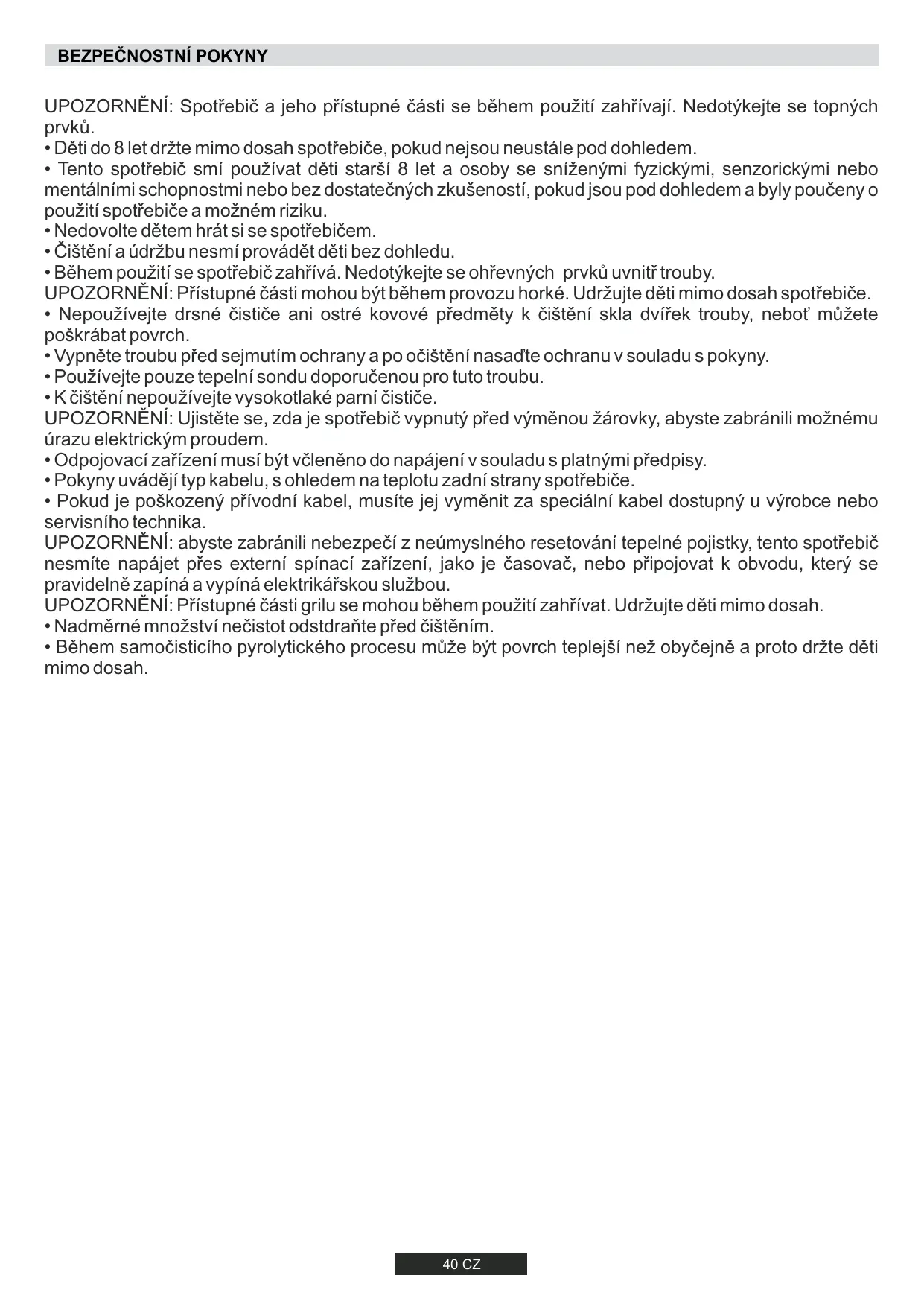 - Během samočisticího pyrolytického procesu může být povrch teplejší než obyčejně a proto držte děti mimo dosah. 40 CZ