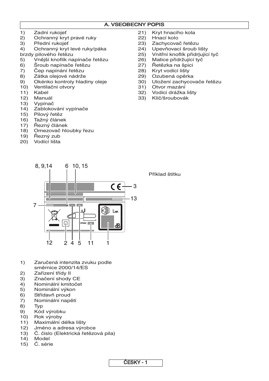 8, 9,14 Kryt hnacího kola Hnací kolo Zachycovač řetězu Upevňovací šroub lišty Vnitřní knoflík přidrĮující tyč Matice přidržující tyč Řetězka na špici Kryt vodící lišty Ozubená opěrka Uložení zachycovače řetězu Otvor mazání Vodicí drážka lišty Klíč/šroubovák 6 10, 15 Příklad štítku