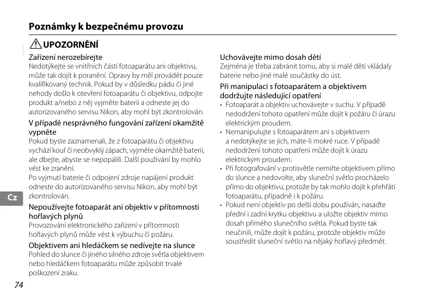 Nedotÿkejte se vnitinich éésti fotoaparätu ani objektivu, müe tak dojit k poranëni. Opravy by mël provädët pouze kvalifikovanÿ technik. Pokud by düsledku pédu &i né nehodÿy doëlo k otevieni fotoaparätu ëi objektivu, odpojte produkt a/nebo z nëj vyjmête baterii a odneste jej do autorizovaného servisu Nikon, aby mohl bÿt zkontrolovän. V pripadé nesprävného fungoväni zaïizeni okamzité vypnête