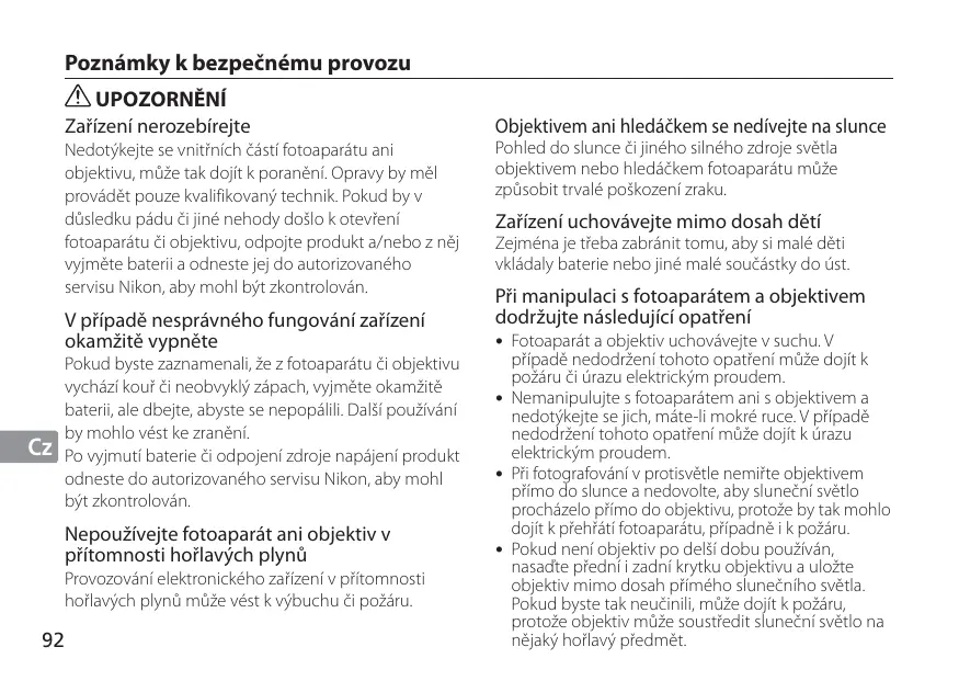 Pokud byste zaznamenali, že z fotoaparátu či objektivu vychází kouř či neobvyklý zápach, vyjměte okamžitě baterii, ale dbejte, abyste se nepopálili. Další používání by mohlo vést ke zranění. Po vyjmutí baterie či odpojení zdroje napájení produkt odneste do autorizovaného servisu Nikon, aby mohl být zkontrolován.