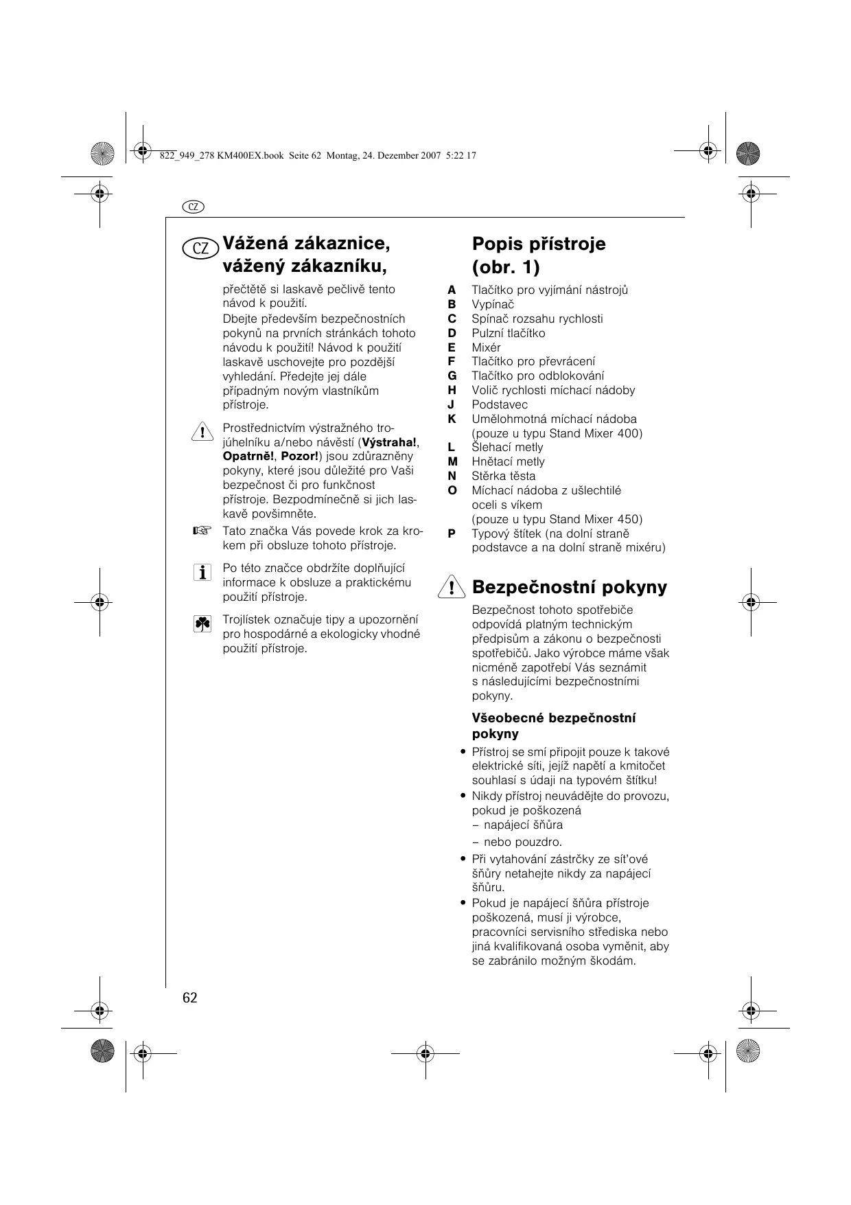 Prostřednictvim vystražného trojuhelníku a/nebo návěsti (Vystrahal!, Opatrně!, Pozor!) jsou zdúraznényPokyny, které jsou duležité pro Vasi bezpečnost Či pro funkčnost pristroje. Bezpodminéčné si jich laskavě povšimnéte.