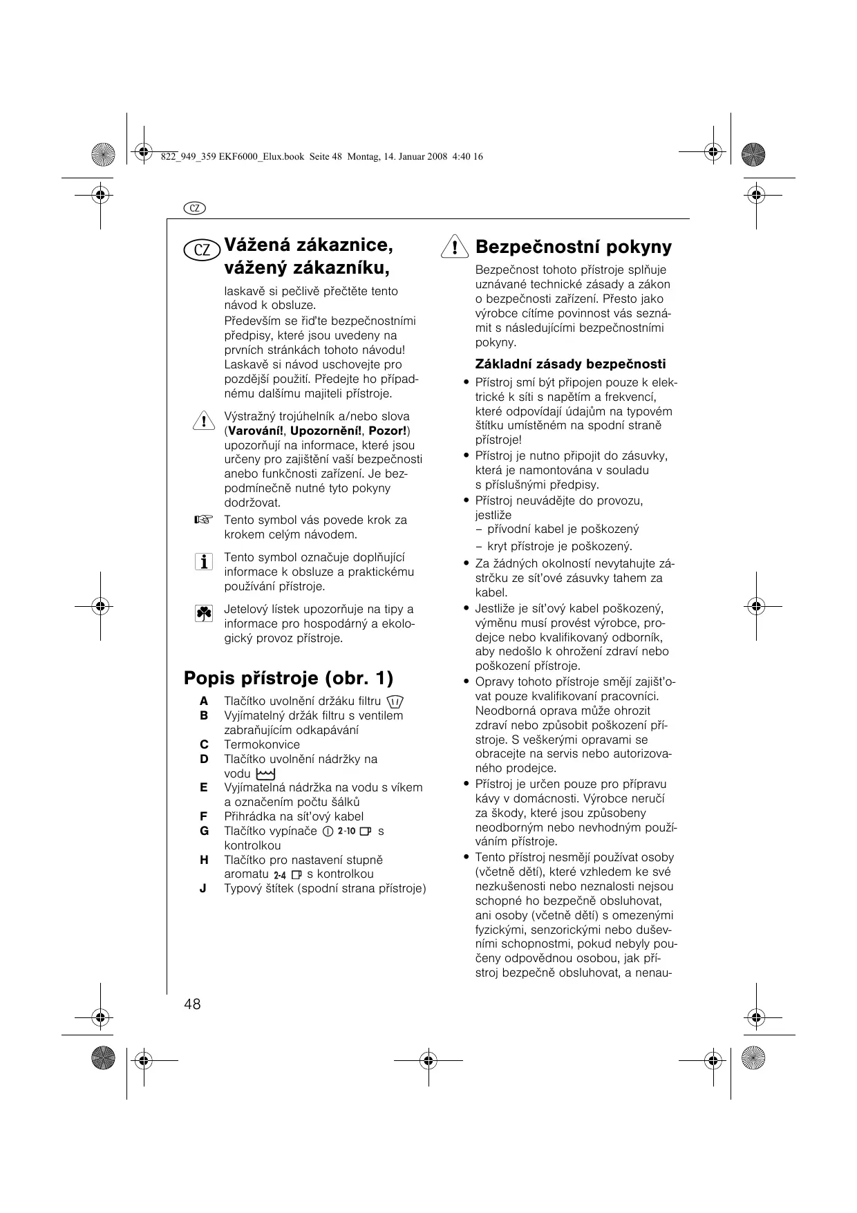 - Tento pøístroj nesmìjí používat osoby (vèetnì dìtí), které vzhledem ke své nezkušenosti nebo neznalosti nejsou schopné ho bezpeènì obsluhovat, ani osoby (vèetnì dìtí) s omezenými fyzickými, senzorickými nebo duševními schopnostmi, pokud nebyly pouèeny odpovìdnou osobou, jak pøístroj bezpeènì obsluhovat, a nenau- 822_949_359 EKF6000_Elux.book Seite 49 Montag, 14. Januar 2008 4:40 16