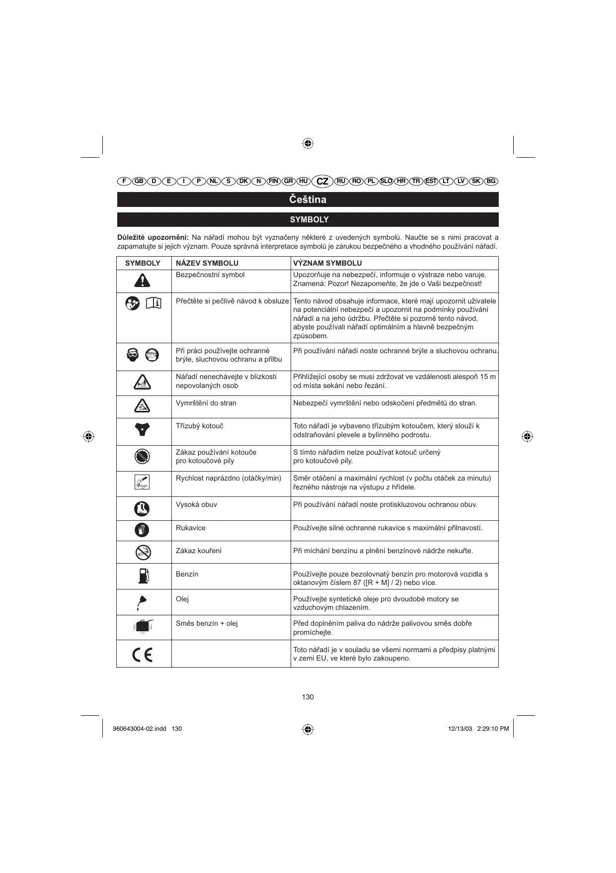 Bezpečnostní symbol Upozorňuje na nebezpečí, informuje o výstraze nebo varuje. Znamená: Pozor! Nezapomeňte, že jde o Vaši bezpečnost! Přečtěte si pečlivě návod k obsluze Tento návod obsahuje informace, které mají upozornit uživatele na potenciální nebezpečí a upozornit na podmínky používání nářadí a na jeho údržbu. Přečtěte si pozorně tento návod, abyste používali nářadí optimálním a hlavně bezpečným způsobem. Při práci používejte ochranné brýle, sluchovou ochranu a přilbu Při používání nářadí noste ochranné brýle a sluchovou ochranu. Nářadí nenechávejte v blízkosti nepovolaných osob Přihlížející osoby se musí zdržovat ve vzdálenosti alespoň 15 m od místa sekání nebo řezání. Vymrštění do stran Nebezpečí vymrštění nebo odskočení předmětů do stran. Třízubý kotouč Toto nářadí je vybaveno třízubým kotoučem, který slouží k odstraňování plevele a bylinného podrostu. Zákaz používání kotouče pro kotoučové pily S tímto nářadím nelze používat kotouč určený pro kotoučové pily. Rychlost naprázdno (otáčky/min) Směr otáčení a maximální rychlost (v počtu otáček za minutu) řezného nástroje na výstupu z hřídele. Vysoká obuv Při používání nářadí noste protiskluzovou ochranou obuv. Rukavice Používejte silné ochranné rukavice s maximální přilnavostí. Zákaz kouření Při míchání benzínu a plnění benzínové nádrže nekuřte. Benzín Používejte pouze bezolovnatý benzín pro motorová vozidla s oktanovým číslem 87 ([R + M] / 2) nebo více. Olej Používejte syntetické oleje pro dvoudobé motory se vzduchovým chlazením. Směs benzín + olej Před doplněním paliva do nádrže palivovou směs dobře promíchejte. Toto nářadí je v souladu se všemi normami a předpisy platnými v zemi EU, ve které bylo zakoupeno.