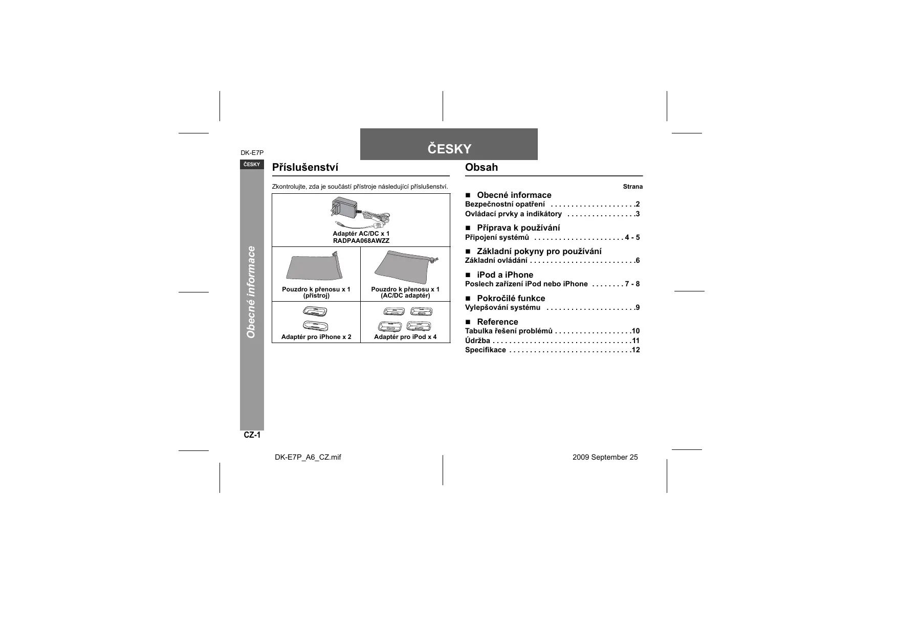 Udräba = Kondenzace Nählé zmény teploty a uskladnëni nebo provez v mimorädné vhkém prostfedi mohou zpüsobit kondenzaci v kabinetu. Kondenzace müze pistro) vyradit z funkce. Pokud se tak stane, nechle pred provozem pristroje napéjeni zapnuté, dokud nebude mozné normälni pfehräväni (asi 1 hodinu). = Pokud se vyskytne problém K zävadë na funkénost toholo vÿrobku müze dojf, pokud je wstaven sinému vnëjäimu ruSent (mechanickému nârazu, nadmêmém stalickému vÿbol, nadmèmému _napéjecimu napêi zpüsobenému boufkou, alé.) nebo pokud neni pouzivän sprävné. Pokud dojde k takovému problému, postupujte nâsle- dovné: 1 Piepnèle pristoj do pohotovosiniho rezimu a poto jej 2novu zapnête. 2 Pokud po predchozim opatfenf nedojde K_ odstranëni problému, odpoite pristroj od zdroje napéjent, znovu jej pripoite a zapnêle. m_ Pied prenésenim pristroje Odpojte zaïizent iPod nebo IPhone z konektoru a zaviele pit). Pristroj automaticky prejde do pohotovostniho rezimu UPOZORNÉNI. Prenäseni plistroje se zapojenÿm zaïizenim iPod nebo iPhone müZe poëkodi oba dva pristroje. DK-E7P_A6_CZmif m_ Gisténi pristroje Pristroj pravidené &istéte jemnou £istou Iétkou. Upozornëni: + K Elëni nepouzivejte Zädné chemikélie (benzin, Fedidlo, alkoholy atd.). To létky mohou poëkodit povrchovou pravu pléëté. Dovnitf pristroje neaplikujte olej. Müze to zpüsobit nefunkënost pfistroje. 2009 September 25