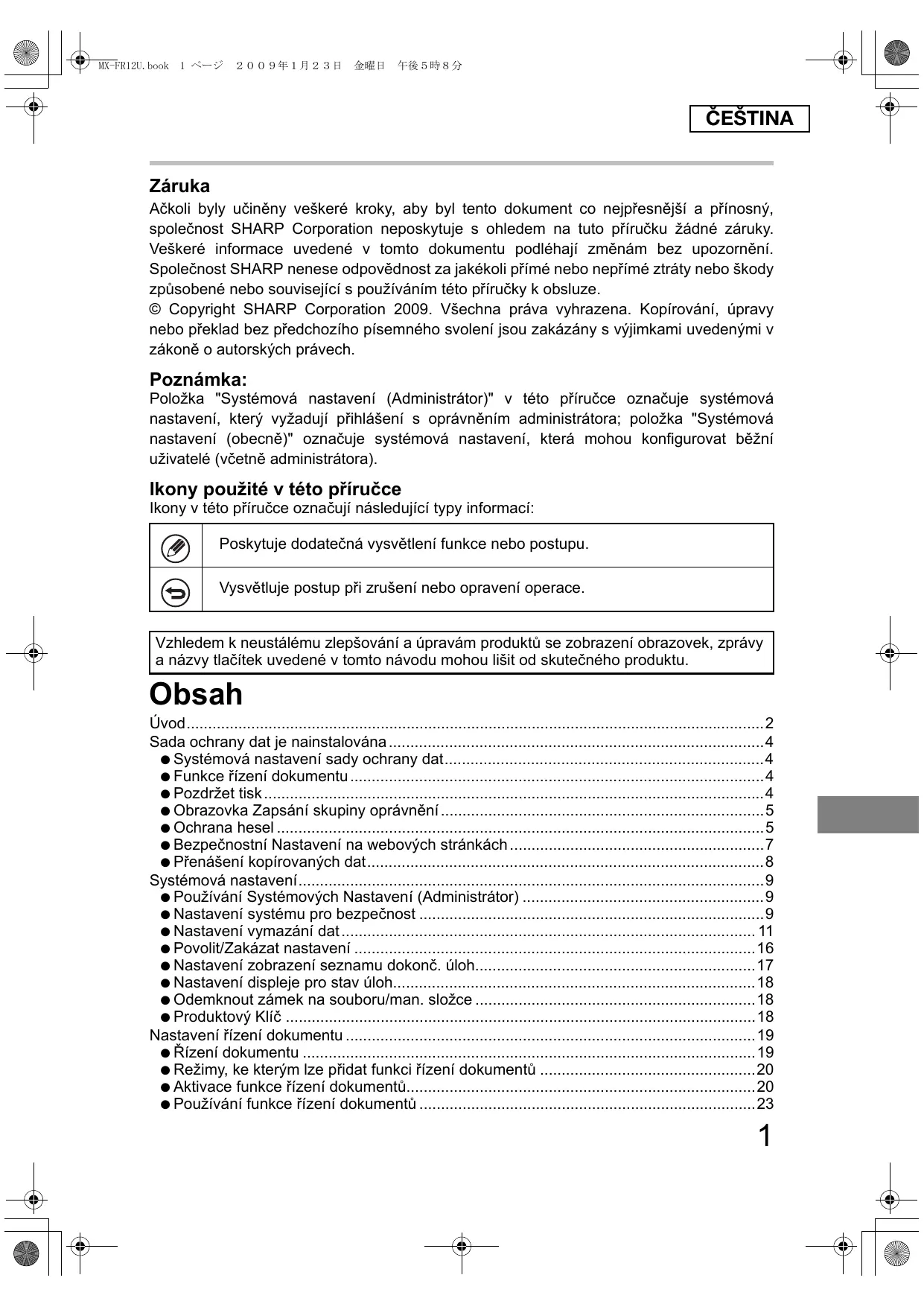 - ČEŠTINA Záruka Ačkoli byly učiněny veškeré kroky, aby byl tento dokument co nejpřesnější a přínosný, společnost SHARP Corporation neposkytuje s ohledem na tuto příručku žádné záruky. Veškeré informace uvedené v tomto dokumentu podléhají změnám bez upozornění. Společnost SHARP nenese odpovědnost za jakékoli přímé nebo nepřímé ztráty nebo škody způsobené nebo související s používáním této příručky k obsluze. © Copyright SHARP Corporation 2009. Všechna práva vyhrazena. Kopírování, úpravy nebo překlad bez předchozího písemného svolení jsou zakázány s výjimkami uvedenými v zákoně o autorských právech. Poznámka: Položka "Systémová nastavení (Administrátor)" v této příručce označuje systémová nastavení, který vyžadují přihlášení s oprávněním administrátora; položka "Systémová nastavení (obecně)" označuje systémová nastavení, která mohou konfigurovat běžní uživatelé (včetně administrátora). Ikony použité v této příručce Ikony v této příručce označují následující typy informací: Poskytuje dodatečná vysvětlení funkce nebo postupu. Vysvětluje postup při zrušení nebo opravení operace. Vzhledem k neustálému zlepšování a úpravám produktů se zobrazení obrazovek, zprávy a názvy tlačítek uvedené v tomto návodu mohou lišit od skutečného produktu. Obsah Úvod p. 2