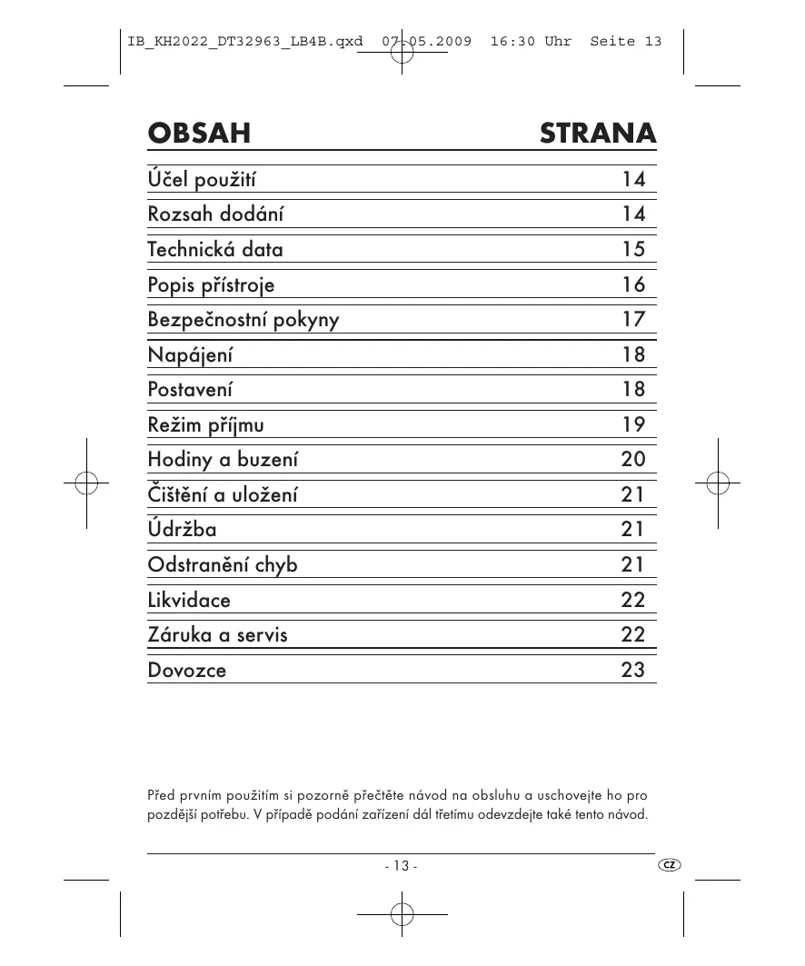 IB_KH2022 DT32963 LB4B.qxd _ 2009 16:30 Uhr Seite 22 Likvidace Pistroi v Zädném pripadë neodhazujte do bëzného domovniho odpadu. | Zlikviduite spotfebië prostfednicivim firmy na likvidaci s prisluënÿm === povolenim nebo zaïizeni na likvidaci komunälniho odpadu. Na tento spofebié se vztahuje evropské smërnice 2002/96/EC. Dodrzujte akiuélni plainé predpisy. V pripadë pochybnosti se spojte s nejbliZëi provozovnou, kieré likviduje podobné vÿrobky. Likvidace baterit/akumulétorÿ Baterie/akumulétory nesmëjf prijit do domovniho odpadu. Kaëdÿ spotrebitel je ze zékona povinen baterie a akumulätory odevzdat na sbërném mistë v obci nebo méstské ëtvrti svého bydlistë. Tato povinnost slouzi k tomu, aby byly baterie/akumulätory odevzdäny k ekologické likvidaci. Baterie/ akumulétory odevzdävejte pouze, jsou-li vybité. Likvidace obalu Také väechny obalové materiély zlikvidujte v souladu s ekologickÿmi predpisy. Zäruka a servis Na tento pristro plati triletä zéruka od data zakoupeni. Nenili mozné telefonické zpracoväni Vaëi reklamace, obdräite zde + iso Vaÿeho spracoväni (éislo RMA) a + adresu, na kterou müxete zaslat Véë vÿrobek pro odbavent zéruky. Pokud budete pristroi odesilat, priloäte prosim kopii nékupniho doklau {pokladniëni déei].Pristroj must bÿt zabalen adekvätnë pro prepravu a ëislo RMA musi bÿt primo viditelné. Zésilky bez ëisla RMA nelze spracovat dél. [C2] -22-