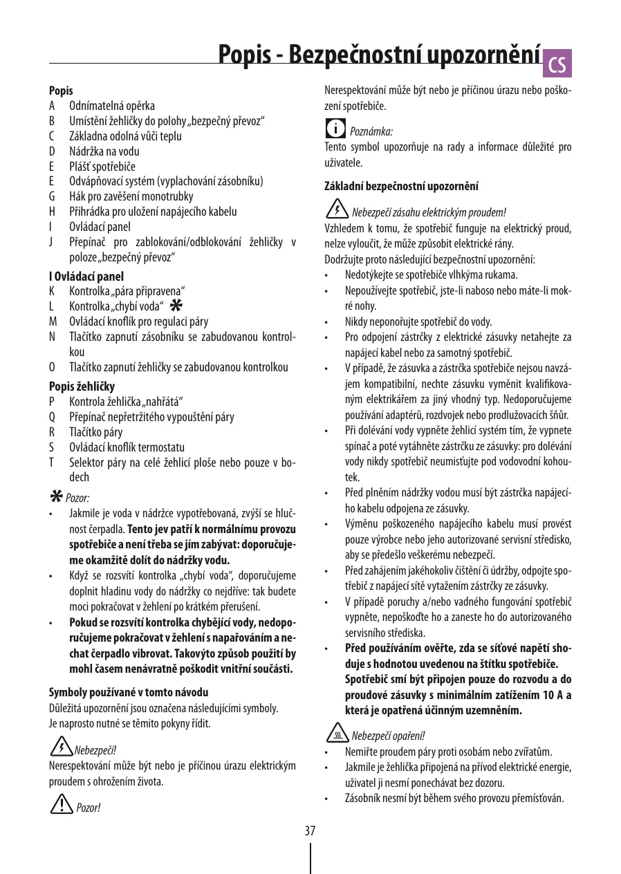 Popis - Bezpečnostní upozornění cs Nerespektování může být nebo je příčinou úrazu nebo poškození spotřebiče. Popis A Odnímatelná opěrka B Umístění žehličky do polohy „bezpečný převoz“ C Základna odolná vůči teplu D Nádržka na vodu E Plášť spotřebiče E Odvápňovací systém (vyplachování zásobníku) G Hák pro zavěšení monotrubky H Přihrádka pro uložení napájecího kabelu I Ovládací panel J Přepínač pro zablokování/odblokování žehličky v poloze „bezpečný převoz“ I Ovládací panel K Kontrolka „pára připravena“ L Kontrolka „chybí voda“ M Ovládací knoflík pro regulaci páry N Tlačítko zapnutí zásobníku se zabudovanou kontrolkou O Tlačítko zapnutí žehličky se zabudovanou kontrolkou Popis žehličky P Kontrola žehlička „nahřátá“ Q Přepínač nepřetržitého vypouštění páry R Tlačítko páry S Ovládací knoflík termostatu T Selektor páry na celé žehlicí ploše nebo pouze v bodech Poznámka: Tento symbol upozorňuje na rady a informace důležité pro uživatele. Základní bezpečnostní upozornění Nebezpečí zásahu elektrickým proudem! Vzhledem k tomu, že spotřebič funguje na elektrický proud, nelze vyloučit, že může způsobit elektrické rány. Dodržujte proto následující bezpečnostní upozornění: