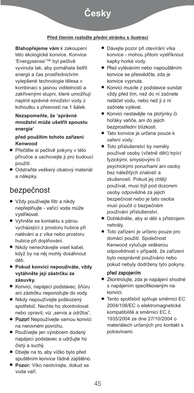 Blahopřejeme vám k zakoupení této ekologické konvice. Konvice ‘Energysense’™ byl pečlivě vyvinuta tak, aby pomáhala šetřit energii a čas prostřednictvím vylepšené technologie tělesa v kombinaci s jasnou viditelností a zakřivenými stupni, které umožňují naplnit správné množství vody z kohoutku s přesností na 1 šálek.