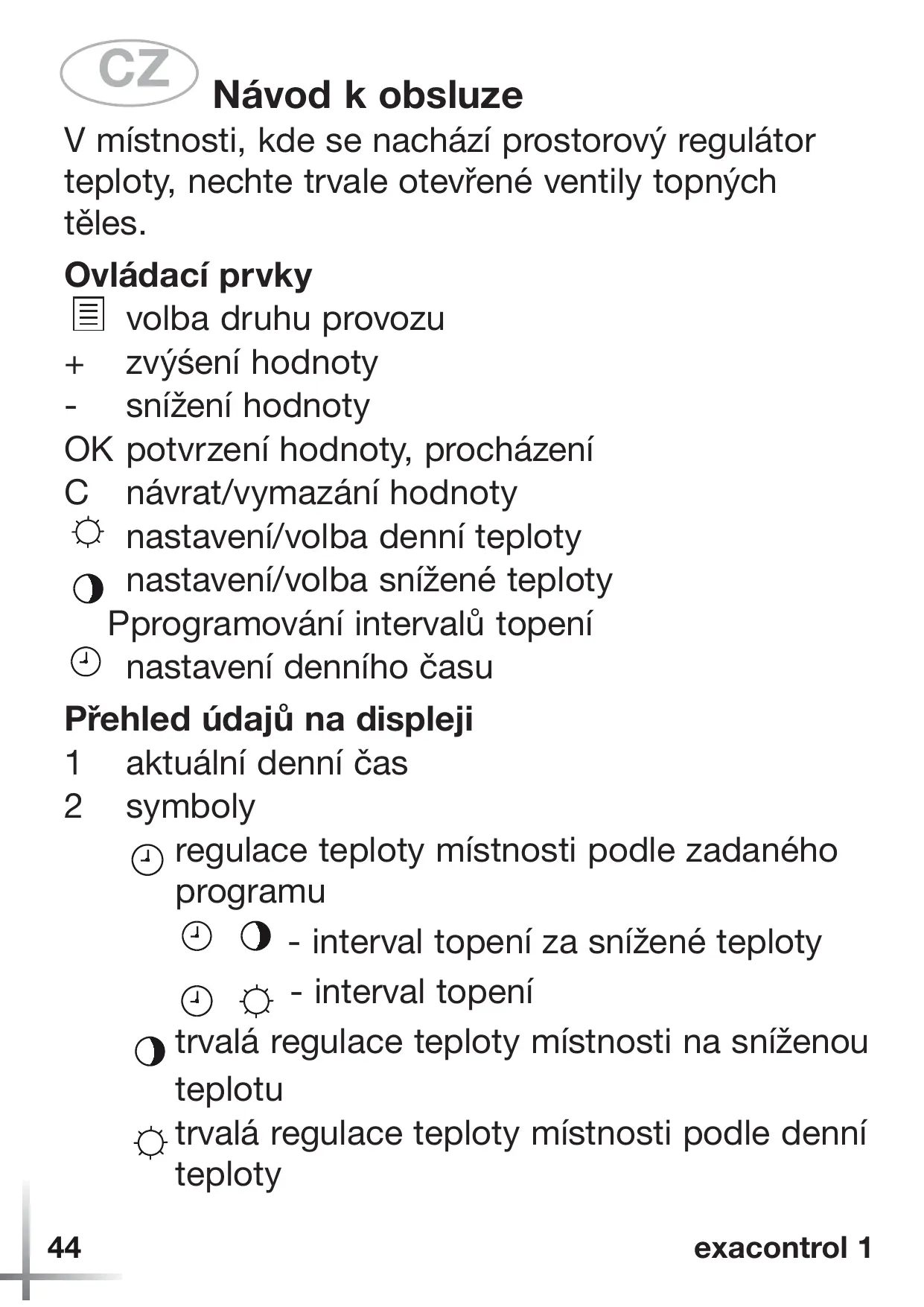 Návod k obsluze V místnosti, kde se nachází prostorový regulátor teploty, nechte trvale otevřené ventily topných těles. Ovládací prvky volba druhu provozu + zvýśení hodnoty - snížení hodnoty OK potvrzení hodnoty, procházení C návrat/vymazání hodnoty nastavení/volba denní teploty nastavení/volba snížené teploty Pprogramování intervalů topení nastavení denního času Přehled údajů na displeji 1 aktuální denní čas 2 symboly regulace teploty místnosti podle zadaného programu - interval topení za snížené teploty - interval topení trvalá regulace teploty místnosti na sníženou teplotu trvalá regulace teploty místnosti podle denní teploty