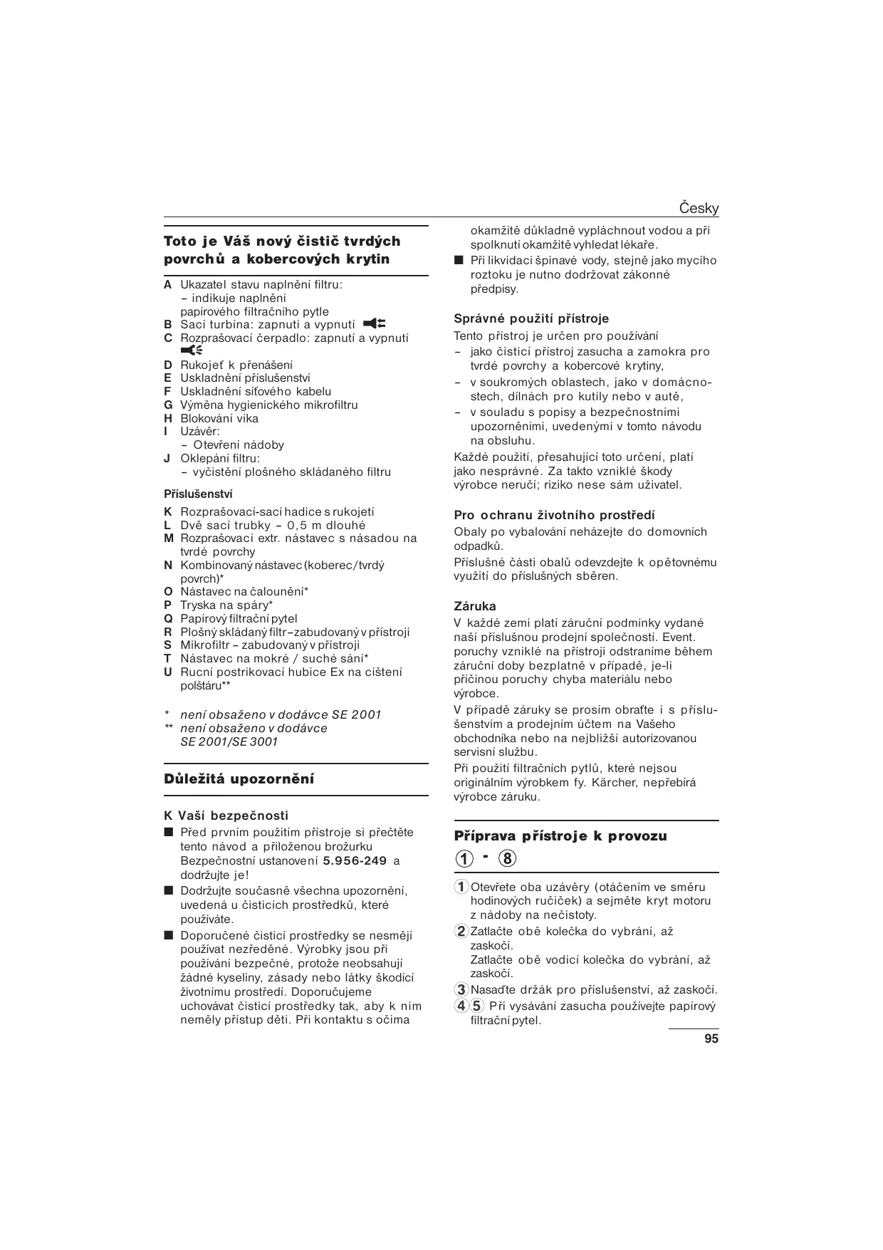 - není obsaženo v dodávce SE 2001 ** není obsaženo v dodávce SE 2001/SE 3001 Důležitá upozornění okamžitě důkladně vypláchnout vodou a při spolknutí okamžitě vyhledat lékaře. ■ Při likvidaci špinavé vody, stejně jako mycího roztoku je nutno dodržovat zákonné předpisy. Správné použití přístroje Tento přístroj je určen pro používání – jako čisticí přístroj zasucha a zamokra pro tvrdé povrch y a kobercové krytiny, – v soukromých oblastech, jako v domácnostech, dílnách pro kutily nebo v autě, – v souladu s popisy a bezpečnostními upozorněními, uvedenými v tomto návodu na obsluhu. Každé použití, přesahující toto určení, platí jako nesprávné. Za takto vzniklé škody výrobce neručí; riziko nese sám uživatel. Pro ochranu životního prostředí Obaly po vybalování neházejte do domovních odpadků. Příslušné části obalů odevzdejte k opětovnému využití do příslušných sběren. Záruka V každé zemi platí záruční podmínky vydané naší příslušnou prodejní společností. Event. poruchy vzniklé na přístroji odstraníme během záruční doby bezplatně v případě, je-li příčinou poruchy chyba materiálu nebo výrobce. V případě záruky se prosím obraťte i s p říslušenstvím a prodejním účtem na Vašeho obchodníka nebo na nejbližší autorizovanou servisní službu. Při použití filtračních pytlů, které nejsou originálním výrobkem fy. Kärcher, nepřebírá výrobce záruku. K Vaší bezpečnosti ■ Před prvním použitím přístroje si přečtěte tento návod a přiloženou brožurku Bezpečnostní ustanovení 5.956-249 a dodržujte je! ■ Dodržujte současně všechna upozornění, uvedená u čisticích prostředků, které používáte. ■ Doporučené čisticí prostředky se nesmějí používat nezředěné. Výrobky jsou při používání bezpečné, protože neobsahují žádné kyseliny, zásady nebo látky škodící životnímu prostředí. Doporučujeme uchovávat čisticí prostředky tak, aby k nim neměly přístup děti. Při kontaktu s očima Příprava přístroje k provozu Otevřete oba uzávěry (otáčením ve směru hodinových ručiček) a sejměte kryt motoru z nádoby na nečistoty. Zatlačte obě kolečka do vybrání, až zaskočí. Zatlačte obě vodicí kolečka do vybrání, až zaskočí. Nasaďte držák pro příslušenství, až zaskočí. P ři vysávání zasucha používejte papírový filtrační pytel.