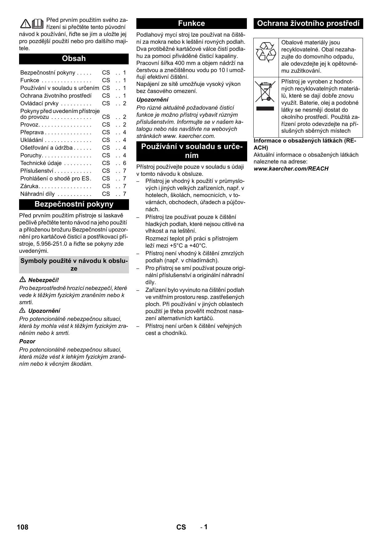 Bezpečnostní pokyny Před prvním použitím přístroje si laskavě pečlivě přečtěte tento návod na jeho použití a přiloženou brožuru Bezpečnostní upozornění pro kartáčové čisticí a postřikovací přístroje, 5.956-251.0 a řiďte se pokyny zde uvedenými. Symboly použité v návodu k obsluze Nebezpečí! Pro bezprostředně hrozící nebezpečí, které vede k těžkým fyzickým zraněním nebo k smrti. 몇 Upozornění Pro potencionálně nebezpečnou situaci, která by mohla vést k těžkým fyzickým zraněním nebo k smrti. Pozor Pro potencionálně nebezpečnou situaci, která může vést k lehkým fyzickým zraněním nebo k věcným škodám.