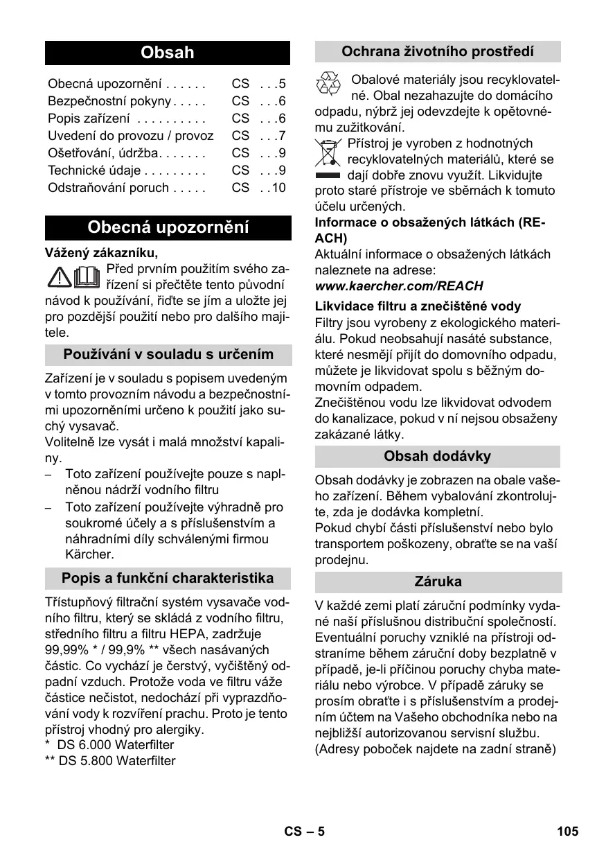 Obecná upozornění Vážený zákazníku, Před prvním použitím svého zařízení si přečtěte tento původní návod k používání, řiďte se jím a uložte jej pro pozdější použití nebo pro dalšího majitele. Používání v souladu s určením Zařízení je v souladu s popisem uvedeným v tomto provozním návodu a bezpečnostními upozorněními určeno k použití jako suchý vysavač. Volitelně lze vysát i malá množství kapaliny. – Toto zařízení používejte pouze s naplněnou nádrží vodního filtru – Toto zařízení používejte výhradně pro soukromé účely a s příslušenstvím a náhradními díly schválenými firmou Kärcher. Obalové materiály jsou recyklovatelné. Obal nezahazujte do domácího odpadu, nýbrž jej odevzdejte k opětovnému zužitkování. Přístroj je vyroben z hodnotných recyklovatelných materiálů, které se dají dobře znovu využít. Likvidujte proto staré přístroje ve sběrnách k tomuto účelu určených. Informace o obsažených látkách (REACH) Aktuální informace o obsažených látkách naleznete na adrese: www.kaercher.com/REACH Likvidace filtru a znečištěné vody Filtry jsou vyrobeny z ekologického materiálu. Pokud neobsahují nasáté substance, které nesmějí přijít do domovního odpadu, můžete je likvidovat spolu s běžným domovním odpadem. Znečištěnou vodu lze likvidovat odvodem do kanalizace, pokud v ní nejsou obsaženy zakázané látky. Obsah dodávky Obsah dodávky je zobrazen na obale vašeho zařízení. Během vybalování zkontrolujte, zda je dodávka kompletní. Pokud chybí části příslušenství nebo bylo transportem poškozeny, obraťte se na vaší prodejnu. Popis a funkční charakteristika Záruka Třístupňový filtrační systém vysavače vodního filtru, který se skládá z vodního filtru, středního filtru a filtru HEPA, zadržuje 99,99% * / 99,9% ** všech nasávaných částic. Co vychází je čerstvý, vyčištěný odpadní vzduch. Protože voda ve filtru váže částice nečistot, nedochází při vyprazdňování vody k rozvíření prachu. Proto je tento přístroj vhodný pro alergiky.
