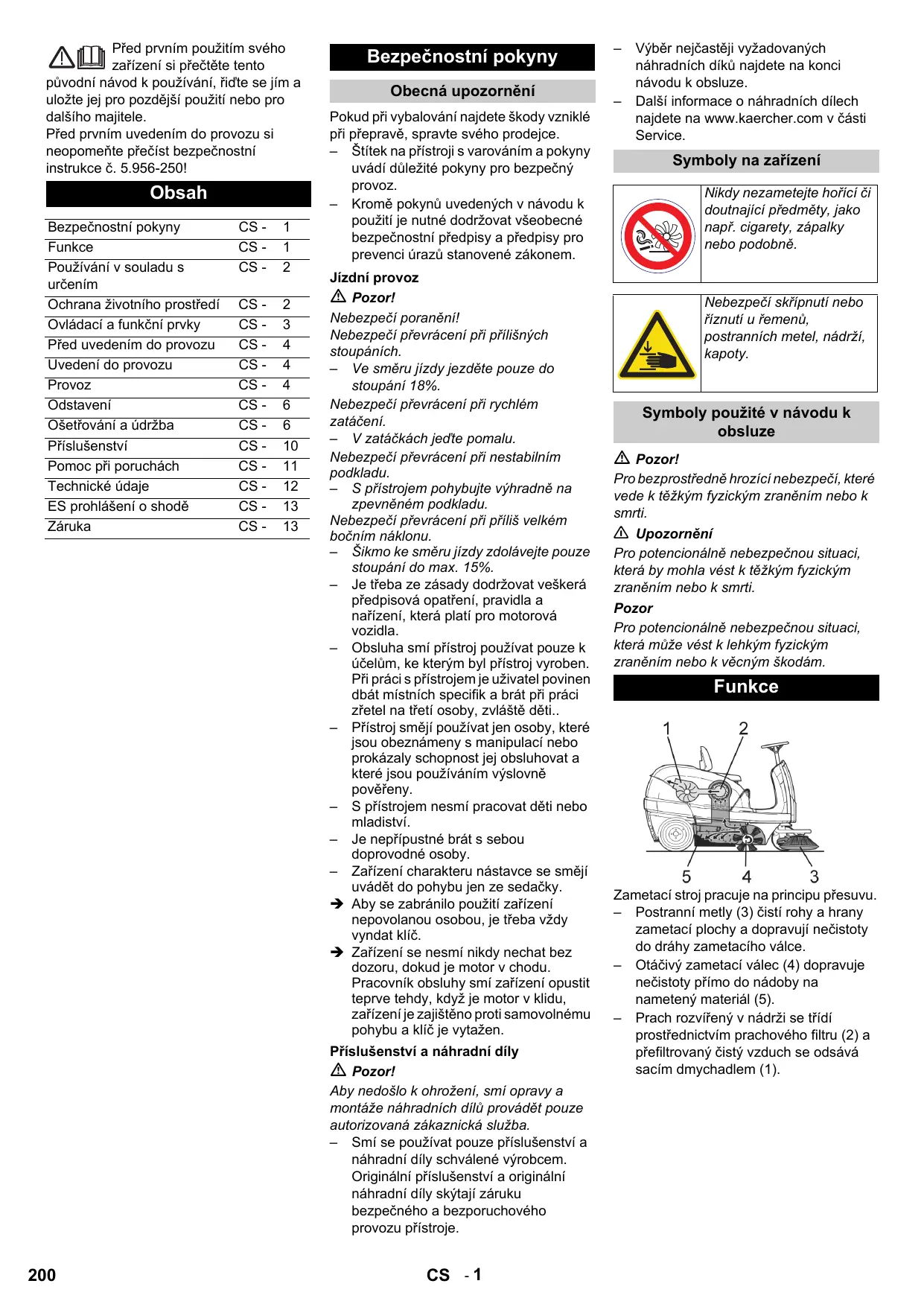 Výběr nejčastěji vyžadovaných náhradních díků najdete na konci návodu k obsluze. Další informace o náhradních dílech najdete na www.kaercher.com v části Service. Symboly na zařízení Nikdy nezametejte hořící či doutnající předměty, jako např. cigarety, zápalky nebo podobně. Nebezpečí skřípnutí nebo říznutí u řemenů, postranních metel, nádrží, kapoty. Symboly použité v návodu k obsluze Pozor! Pro bezprostředně hrozící nebezpečí, které vede k těžkým fyzickým zraněním nebo k smrti. 몇 Upozornění Pro potencionálně nebezpečnou situaci, která by mohla vést k těžkým fyzickým zraněním nebo k smrti. Pozor Pro potencionálně nebezpečnou situaci, která může vést k lehkým fyzickým zraněním nebo k věcným škodám. Funkce Zametací stroj pracuje na principu přesuvu. – Postranní metly (3) čistí rohy a hrany zametací plochy a dopravují nečistoty do dráhy zametacího válce. – Otáčivý zametací válec (4) dopravuje nečistoty přímo do nádoby na nametený materiál (5). – Prach rozvířený v nádrži se třídí prostřednictvím prachového filtru (2) a přefiltrovaný čistý vzduch se odsává sacím dmychadlem (1). Používání v souladu s určením Zametací stroj používejte výlučně v souladu s údaji tohoto návodu k obsluze. Î Přístroj s pracovními zařízením musíte před použitím zkontrolovat ohledně řádného stavu a bezpečnosti provozu. Pokud jejich stav není bez závad, nelze je používat. – Tento zametací stroj je určen k zametání znečištěných ploch ve vnitřním a venkovním prostoru. – Zařízení není schváleno pro veřejnou silniční dopravu. – Přístroj není vhodný k odsávání prachů ohrožujících zdraví. – Na přístroji neprovádějtě žádné úpravy. – Nikdy přístrojem nemeťte/nenasávejte jakékoliv hořlaviny či zápalné látky jako jsou explozivní kapaliny, hořlavé plyny, neředěné kyseliny, rozpouštědla, K tomu patří benzín, ředidla barev nebo topné oleje, které při smíšení s nasávaným vzduchem mohou tvořit výbušné plyny nebo směsi, dále aceton, nezředěné kyseliny nebo rozpouštědla, které napadají materiály použité na přístroji. – Nikdy přístrojem nemeťte/nenasávejte hořící či doutnající předměty! – Přistroj je určen pouze pro povrchy určené v návodu. – Najíždět smíte jen na plochy schválené pro použití stroje podnikatelem nebo jeho zmocněncem. – Pobyt v ohroženém prostoru je zakázán. Nikdy nepracujte v prostorách, ve kterých hrozí nebezpečí exploze! – Obecně platí: Snadno vznětlivé látky udržujte v dostatečné vzdálenosti od přístroje (nebezpečí výbuchu/požáru). Ochrana životního prostředí Obalové materiály jsou recyklovatelné. Obal nezahazujte do domovního odpadu, ale odevzdejte jej k opětovnému zužitkování. Přístroj je vyroben z hodnotných recyklovatelných materiálů, které je třeba znovu využít. Baterie, olej a podobné látky se nesmějí dostat do okolního prostředí. Použitá zařízení proto odevzdejte na příslušných sběrných místech Informace o obsažených látkách (REACH) Aktuální informace o obsažených látkách naleznete na adrese: http://www.karcher.de/de/unternehmen/ umweltschutz/REACH.htm Vhodné podlahy