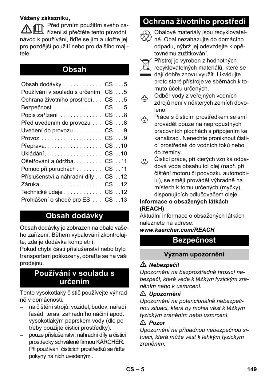 Ochrana životního prostředí Obalové materiály jsou recyklovatelné. Obal nezahazujte do domácího odpadu, nýbrž jej odevzdejte k opětovnému zužitkování. Přístroj je vyroben z hodnotných recyklovatelných materiálů, které se dají dobře znovu využít. Likvidujte proto staré přístroje ve sběrnách k tomuto účelu určených. Odběr vody z veřejných vodních zdrojů není v některých zemích dovoleno. Práce s čisticím prostředkem se smí provádět pouze na nepropustných pracovních plochách s připojením ke kanalizaci. Nenechte proniknout čisticí prostředek do vodních toků nebo do zeminy. Čisticí práce, při kterých vzniká odpadová voda obsahující olej (např. při čištění motoru či podvozku automobilu), se smějí provádět výhradně na místech k tomu určených (myčky), disponujících odlučovačem oleje. Informace o obsažených látkách (REACH) Aktuální informace o obsažených látkách naleznete na adrese: