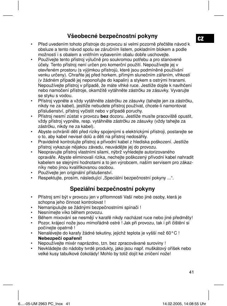 Přístroj smí být v provozu jen v přítomnosti Vaší nebo jiné osoby, která je schopna jeho činnost kontrolovat ! Nemanipulujte se žádnými bezpečnostními spínači ! Nesnímejte víko během provozu. Během mixování se nesmějí v karafě nikdy nacházet ruce nebo jiné předměty! Pozor, krájecí nože jsou mimořádně ostré ! Jak při provozu, tak i při čištění si počínejte opatrně ! Nenalévejte do karafy žádné tekutiny, jejichž teplota je vyšší než 60°C ! Nebezpečí opaření! Nepoužívejte mixér naprázdno, tzn. bez zpracovávané suroviny ! Nevkládejte do nádoby tvrdé produkty, jako jsou např. muškátový oříšek nebo velké kusy tabulkové čokolády! Mohlo by totiž dojít ke zničení nože!