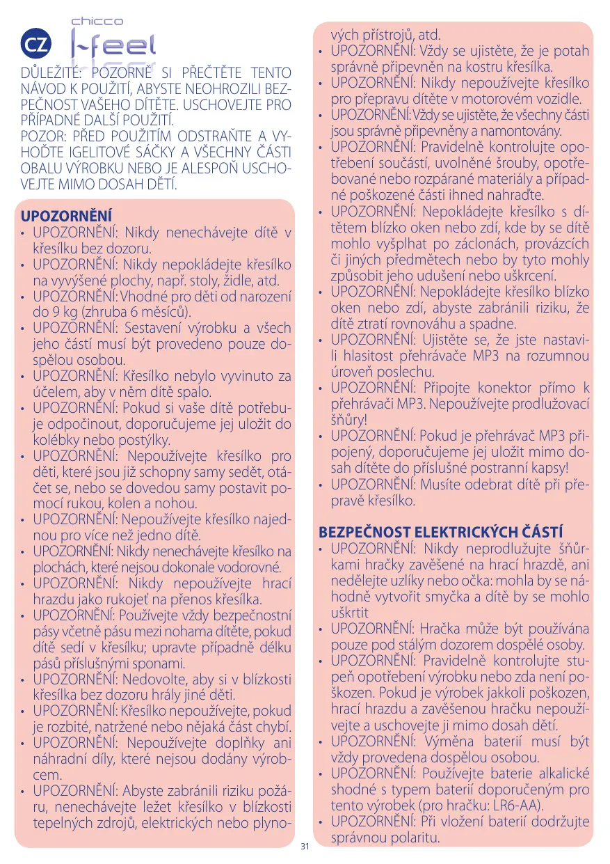 DŮLEŽITÉ: POZORNĚ SI PŘEČTĚTE TENTO NÁVOD K POUŽITÍ, ABYSTE NEOHROZILI BEZPEČNOST VAŠEHO DÍTĚTE. USCHOVEJTE PRO PŘÍPADNÉ DALŠÍ POUŽITÍ. POZOR: PŘED POUŽITÍM ODSTRAŇTE A VYHOĎTE IGELITOVÉ SÁČKY A VŠECHNY ČÁSTI OBALU VÝROBKU NEBO JE ALESPOŇ USCHOVEJTE MIMO DOSAH DĚTÍ. UPOZORNĚNÍ