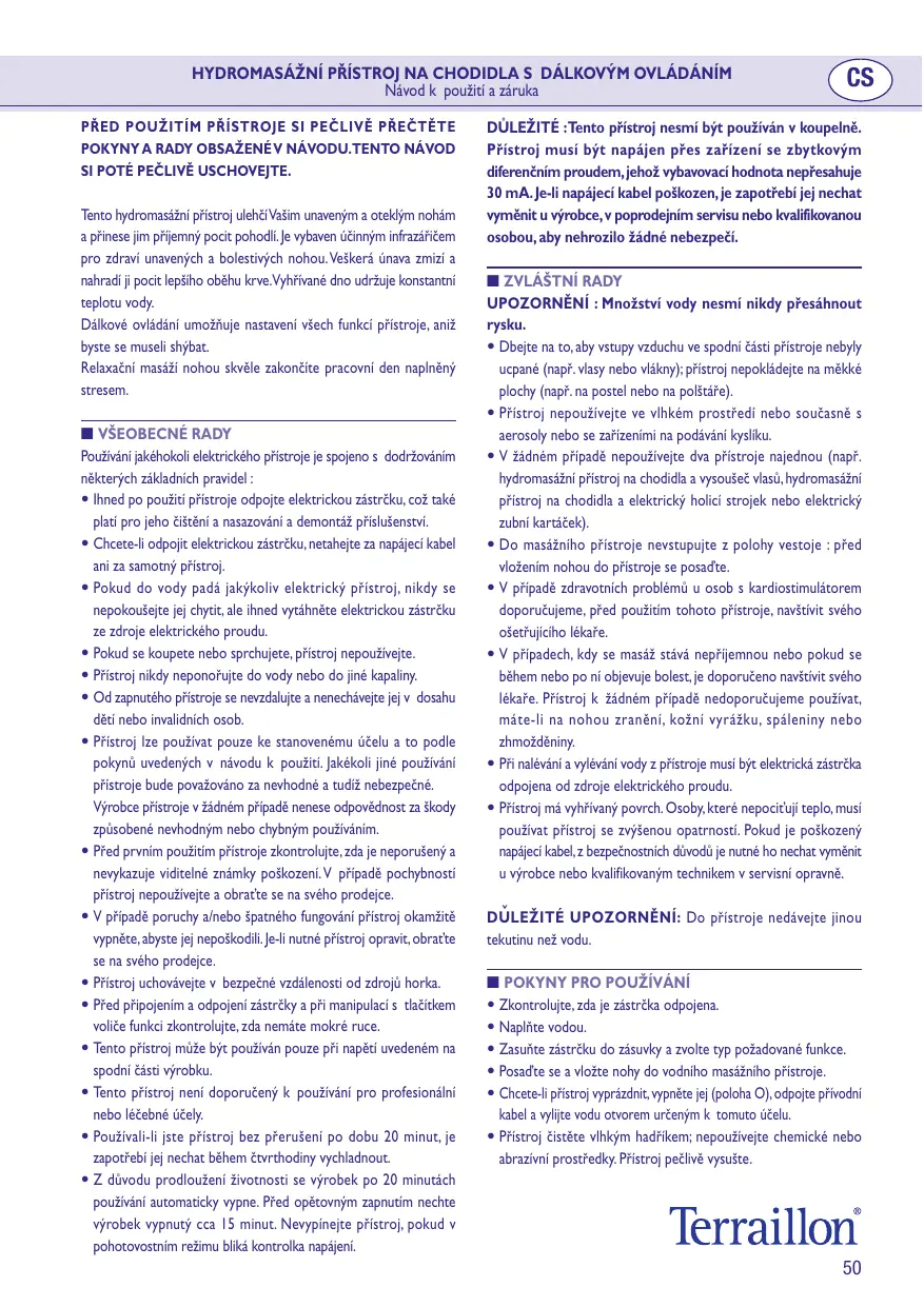 • Cet appareil n’est pas recommandé pour des utilisations à des fins professionnelles ou curatives. • Après avoir utilisé l’appareil sans interruption pendant une durée de 20 minutes, il est nécessaire de le laisser refroidir pendant au moins 15 minutes. • Pour optimiser la durée de vie du produit, l’alimentation s’arrête automatiquement après 20 minutes d’utilisation et ne se remet en marche qu’après 15 minutes d’attente. Ne débranchez pas l’appareil lorsque la diode d’alimentation clignote durant cette période d’attente. IMPORTANT : Cet appareil ne doit pas être utilisé dans une salle d’eau. L’appareil devrait être alimenté par l’intermédiaire d’un dispositif à courant différentiel résiduel ayant un courant de déclenchement n’excédant pas 30 mA. Si le câble est endommagé, il doit être remplacé par le fabricant, son service après-vente ou des personnes de qualifications similaires afin d’éviter le danger. ■ CONSEILS PARTICULIERS ATTENTION : La quantité d’eau ne doit jamais dépasser le niveau maximum indiqué. • Faites attention que les entrées d’air sur le fond de l’appareil ne soient jamais bouchées (comme par exemple : des cheveux, des fils,…) ; éviter de poser l’appareil sur des superficies molles (comme par exemple: lit ou coussins ). • Ne pas utiliser l’appareil dans des endroits humides ou durant l’utilisation d’aérosols ou administration d’oxygène. • N’utiliser en aucun cas deux appareils en même temps (par exemple : hydromassage plantaire et sèche-cheveux, hydromassage plantaire et rasoir électrique ou brosse à dents électrique). • Ne pas se mettre debout dans l’hydromasseur : s’asseoir avant de mettre les pieds dans l’eau. • En cas de problèmes de santé et pour les personnes munis de pacemaker, il est recommandé de consulter son médecin avant toute utilisation de l’appareil. • Dans le cas où le massage est désagréable ou s’il provoque des douleurs aussi bien durant qu’après le traitement, il est conseillé de consulter son médecin. Dans tous les cas, il est recommandé de ne pas utiliser l’appareil en présence de blessures, éruptions cutanées, brûlures ou contusions. • Durant les opérations de remplissage et de vidange, la prise doit toujours être débranchée de la prise de courant. IMPORTANT : Cet appareil ne doit fonctionner qu’avec de l’eau.