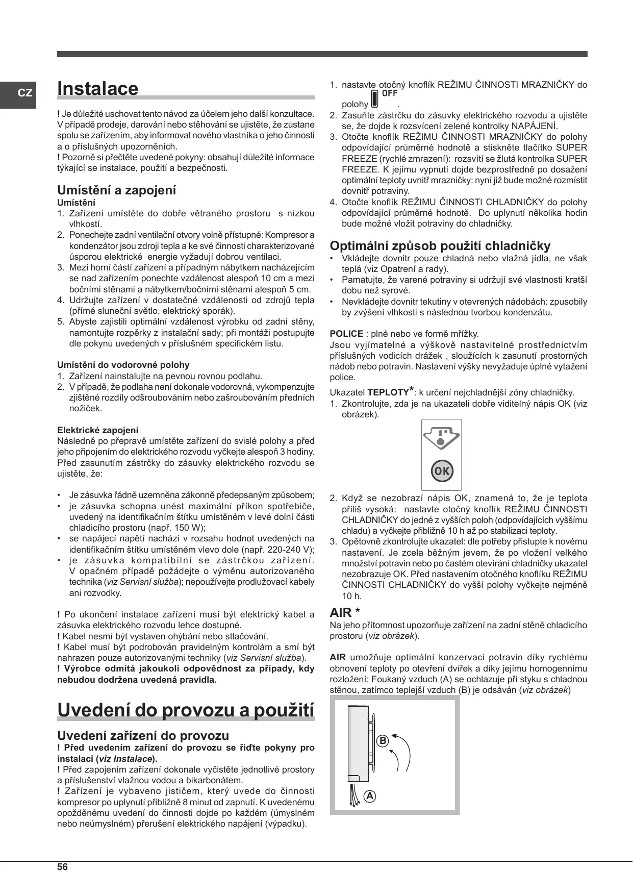 nastavení. Je zcela běžným jevem, že po vložení velkého množství potravin nebo po častém otevírání chladničky ukazatel nezobrazuje OK. Před nastavením otočného knoflíku REŽIMU ČINNOSTI CHLADNIČKY do vyšší polohy vyčkejte nejméně 10 h. AIR * Na jeho přítomnost upozorňuje zařízení na zadní stěně chladicího prostoru (viz obrázek). AIR umožňuje optimální konzervaci potravin díky rychlému obnovení teploty po otevření dvířek a díky jejímu homogennímu rozložení: Foukaný vzduch (A) se ochlazuje při styku s chladnou stěnou, zatímco teplejší vzduch (B) je odsáván (viz obrázek) Uvedení do provozu a použití Uvedení zařízení do provozu ! Před uvedením zařízení do provozu se řiďte pokyny pro instalaci (viz Instalace). ! Před zapojením zařízení dokonale vyčistěte jednotlivé prostory a příslušenství vlažnou vodou a bikarbonátem. ! Zařízení je vybaveno jističem, který uvede do činnosti kompresor po uplynutí přibližně 8 minut od zapnutí. K uvedenému opožděnému uvedení do činnosti dojde po každém (úmyslném nebo neúmyslném) přerušení elektrického napájení (výpadku).