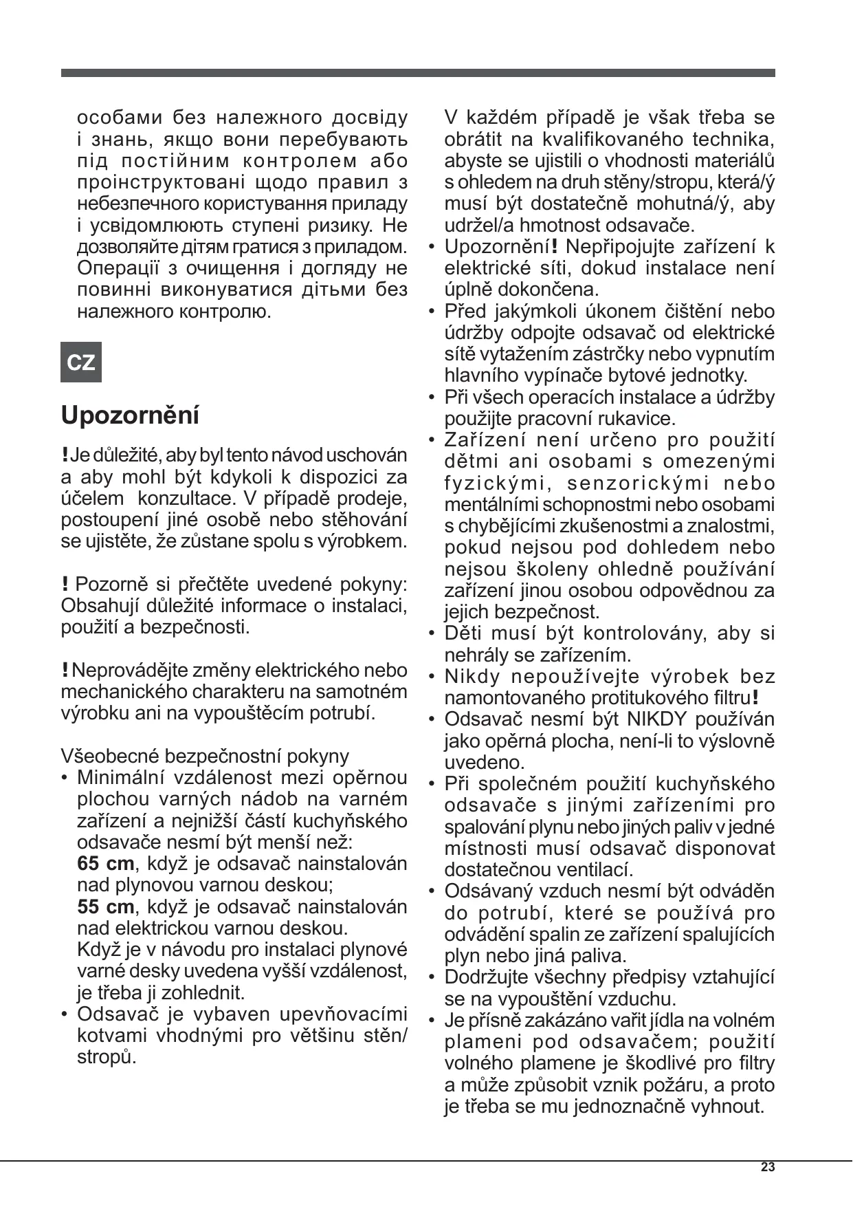 - Дозволяється користування цим приладом дітьми віком від 8 років, а також особами з обмеженими фізичними, сенсорними або розумовими можливостями або особами без належного досвіду і знань, якщо вони перебувають під постійним к онтролем або проінструктовані щодо правил з небезпечного користування приладу і усвідомлюють ступені ризику. Не дозволяйте дітям гратися з приладом. Операції з очищення і догляду не повинні виконуватися дітьми без належного контролю. Upozornění ! Je důležité, aby byl tento návod uschován a aby mohl být kdykoli k dispozici za účelem konzultace. V případě prodeje, postoupení jiné osobě nebo stěhování se ujistěte, že zůstane spolu s výrobkem. ! Pozorně si přečtěte uvedené pokyny: Obsahují důležité informace o instalaci, použití a bezpečnosti. ! Neprovádějte změny elektrického nebo mechanického charakteru na samotném výrobku ani na vypouštěcím potrubí. Všeobecné bezpečnostní pokyny