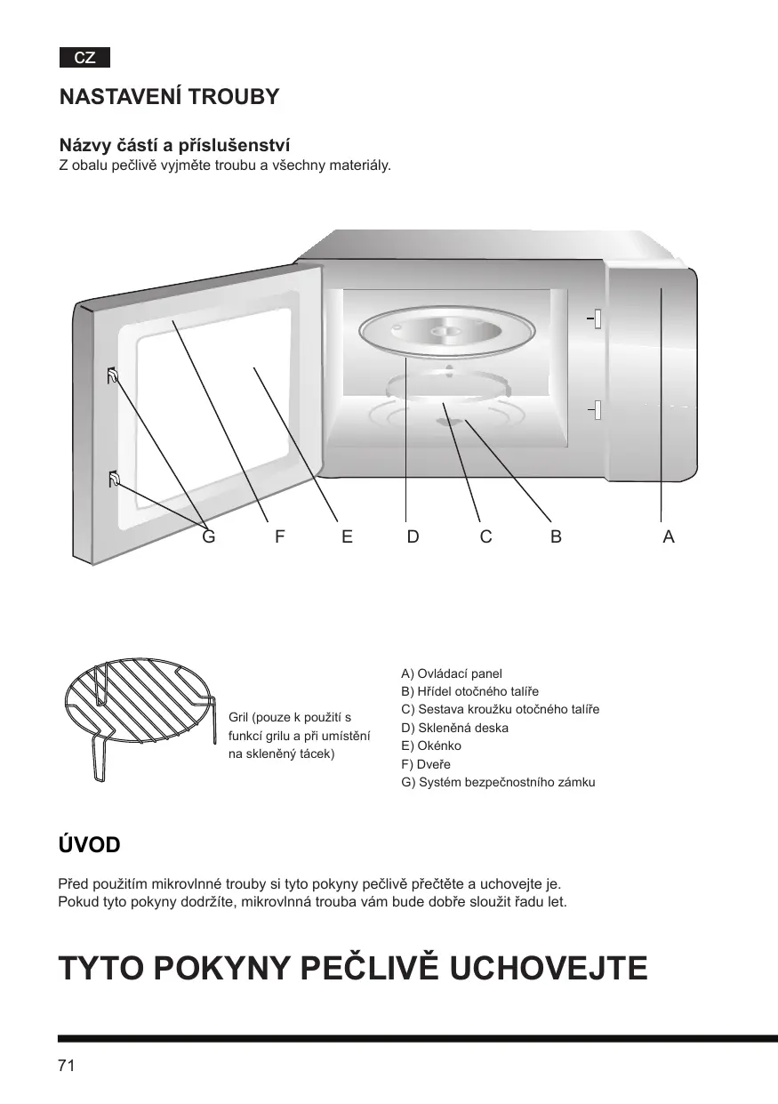 B A) Ovládací panel B) Hřídel otočného talíře C) Sestava kroužku otočného talíře D) Skleněná deska E) Okénko F) Dveře G) Systém bezpečnostního zámku