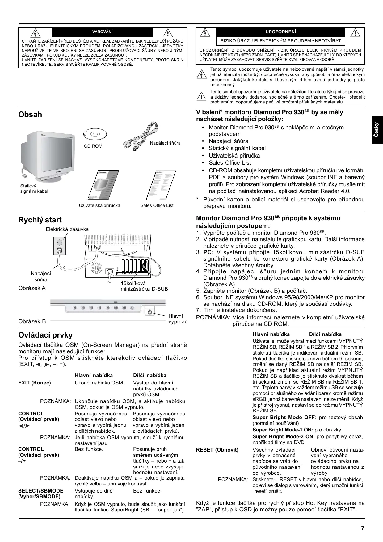 1. Vypněte počítač a monitor Diamond Pro 930SB. 2. V případě nutnosti nainstalujte grafickou kartu. Další informace naleznete v příručce grafické karty. 3. PC: V systému připojte 15kolíkovou minizástrčku D-SUB signálního kabelu ke konektoru grafické karty (Obrázek A). Dotáhněte všechny šrouby. 4. Připojte napájecí šňůru jedním koncem k monitoru Diamond Pro 930SB a druhý konec zapojte do elektrické zásuvky (Obrázek A). 5. Zapněte monitor (Obrázek B) a počítač. 6. Soubor INF systému Windows 95/98/2000/Me/XP pro monitor se nachází na disku CD-ROM, který je součástí dodávky. 7. Tím je instalace dokončena. POZNÁMKA: Více informací naleznete v kompletní uživatelské příručce na CD ROM. Hlavní nabídka Dílčí nabídka Uživatel si může vybrat mezi funkcemi VYPNUTÝ REŽIM SB, REŽIM SB 1 a REŽIM SB 2. Při prvním stisknutí tlačítka je indikován aktuální režim SB. Pokud tlačítko stisknete znovu během tří sekund, změní se daný REŽIM SB na další REŽIM SB. Pokud je například aktuální režim VYPNUTÝ REŽIM SB a tlačítko je stisknuto dvakrát během tří sekund, změní se REŽIM SB na REŽIM SB 1, atd. Teplota barvy v každém režimu SB se serizuje pomocí príslušného ovládání barev kromě režimu sRGB, jehož barevné nastavení nelze měnit. Když je přístroj vypnut, nastaví se do režimu VYPNUTÝ REŽIM SB. Super Bright Mode OFF: pro textový obsah (normální používání) Super Bright Mode-1 ON: pro obrázky Super Bright Mode-2 ON: pro pohyblivý obraz, například filmy na DVD RESET (Obnovit) Všechny ovládací Obnoví původní nastaprvky v označené vení vybraného nabídce se vrátí do ovládacího prvku na původního nastavení hodnotu nastavenou z od výrobce. výroby. POZNÁMKA: Stisknete-li RESET v hlavní nebo dílčí nabídce, objeví se dialog s varováním, který umožní funkci “reset” zrušit.