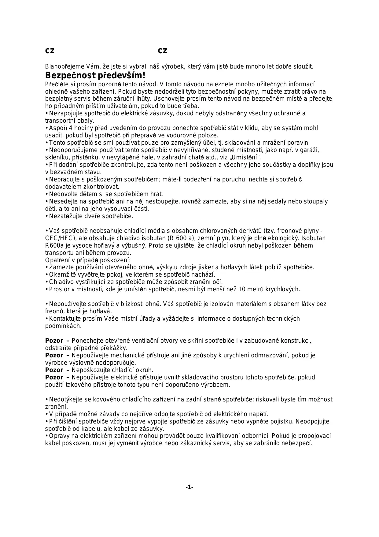 cz cz Blahoprejeme Vâm, 2e jste si vybrali nâë vyrobek, kterÿ vâm jisté bude mnoho let dobie slouzit. Bezpeënost p'edevsim! Preëtète si prosim pozorné tento nâvod. V tomto nâvodu naleznete mnoho uZiteënÿch informaci ohledné va$eho zaïizeni. Pokud byste nedodrzeli tyto bezpeënostni pokyny, müzete ztratit prâvo na bezplatnÿ servis béhem zéruëni Ihüty. Uschovejte prosim tento névod na bezpeëném misté a predejte ho pripadnyÿm pristim uZivatelüm, pokud to bude treba. + Nezapojujte spotrebié do elektrické zäsuvky, dokud nebyly odstranëny véechny ochranné a transportni obaly. + Aspoñ 4 hodiny pred uvedenim do provozu ponechte spotrebië stât v klidu, aby se systém mohl usadit, pokud byl spotrebié pri prepravé ve vodorovné poloze. -+Tento spotrebié se smi pouzivat pouze pro zamÿSlenÿ üéel, tj. skladoväni à mrazeni poravin. + Nedoporuëujeme pouivat tento spotrebië v nevyhrivané, studené mistnosti, jako napï. v garäzi, skleniku, pristënku, v nevytépéné hale, v zahradni chaté atd., viz ,Umistëni". -Pti dodäni spotrebièe zkontrolujte, zda tento neni poëkozen a véechny jeho souëästky a doplñky jsou v bezvadném stavu. + Nepracujte s poSkozenÿm spotrebièem; mâte-li podezreni na poruchu, nechte si spotrebië dodavatelem zkontrolovat. + Nedovolte détem si se spotfebiéem hrât. + Nesedejte na spotrebié ani na nëj nestoupejte, rovnëz zamezte, aby si na nëj sedaly nebo stoupaly déti, a to ani na jeho vysouvaci êâsti. + Nezatëzujte dvere spotrebièe. + Väë spotrebié neobsahuje chladici média s obsahem chlorovanÿch derivätü (tzv. freonové plyny - CFC/HFC), ale obsahuje chladivo isobutan (R 600 a), zemni plyn, kterÿ je plné ekologickÿ. Isobutan R600a je vysoce hoïlavÿ a vÿbuënÿ. Proto se ujistète, Ze chladici okruh nebyl poëkozen bëhem transportu ani bëhem provozu. Opatreni v pripadë poskozeni: +Zamezte pouziväni otevreného ohnë, vÿskytu zdroje jisker a hoïlavÿch létek pobliz spotrebiée. + Okamzité vyvétrejte pokoj, ve kterém se spotrebié nachäzi. + Chladivo vystrikujici ze spotrebiée müze zpüsobit zranëni oëi. + Prostor v mistnosti, kde je umistën spotrebië, nesmi bÿt menSi neZ 10 metrü krychlovÿch. + Nepouzivejte spotrebië v blizkosti ohnë. V4ë spotrebié je izolovän materiélem s obsahem lâtky bez freonû, kterä je hoïlavä. + Kontaktujte prosim Vase mistni ürady a vyZädejte si informace o dostupnÿch technickÿch podminkäch. Pozor - Ponechejte otevrené ventilaënf otvory ve skïini spotrebiée i v zabudované konstrukci, odstrañte pripadné prekäZky. Pozor - Nepouzivejte mechanické pristroje ani jiné zpüsoby k urychleni odmrazoväni, pokud je vÿrobce vÿslovné nedoporuëuje. Pozor - Nepoëkozujte chladici okruh. Pozor - Nepouzivejte elektrické pristroje uvnitr skladovaciho prostoru tohoto spotrebiée, pokud pouziti takového pristroje tohoto typu neni doporuëeno vÿrobcem. + Nedotÿkejte se kovového chladiciho zaïizeni na zadni strané spotrebiée; riskovali byste tim moznost zranëni. 4 pifpadè moné zävady co nejdïive odpojte spotrebié od elektrického napéti. i ëni spotrebiée vzdy nejprve vypojte spotrebié ze zäsuvky nebo vypnête pojistku. Neodpojujte spotrebié od kabelu, ale kabel ze zäsuvky. + Opravy na elektrickém zaïizeni mohou provédét pouze kvalifikovani odbornici. Pokud je propojovaci kabel poëkozen, musi jej vyménit vÿrobce nebo zâkaznickÿ servis, aby se zabränilo nebezpeëi.