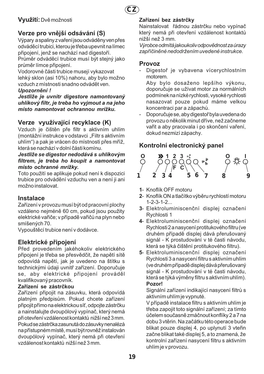 Vpripadë nepravidelného choduodpojitzarizeni ze sité na dobu 5-tivterin a pak znovu zapojitdo elektrické sitë. Jestlize chod je i nadäle nepravidelnÿ, obrétitsenaopraväiské stredisko. Upozoméni Odsävanÿ vzduch nesmi bÿt odvädën do potrubniho vedeni uréeného na odvod spalin se zaïizeni pohänénÿchjinounez elektrickou energif -_V pripadë, Ze jsou souëasné s digestori vyuziväna dalëi zafizeni pohänëné jinou nez elektrickou energii, musi bÿt zajiëtëno primérené odvéträväni mistnosti. - Je prisnë zakäzäno pripravovat jidla na otevreném plameni pod digestoïi. Aplikace primého plamene je profiltry Skodlivé a müze zpüsobit poZär, proto je treba se ji za v&ech okolnosti vyhnout -__ PfismaZeni musite dâvatpozor, aby prehrätÿ olej nevzplanul. -_ Pokud jde o technickä a bezpeënostni i, kterä museji bÿt prijatakvüli odvodu spalin, pridréte se prisnétoho, coje stanoveno vnaïizenich mistnich odpovédnÿch orgänü. -_ Vÿrobce odmité jakoukoliv odpovédnost za ürazy zapriëinéné nedodrzenim uvedené instrukce.