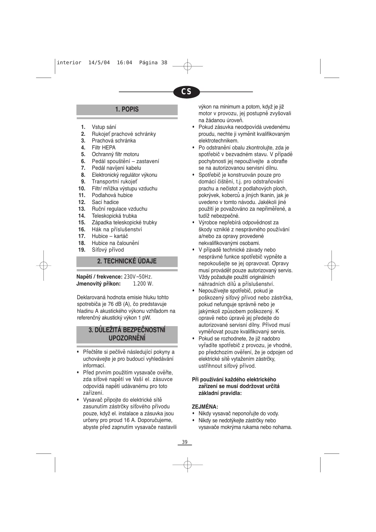 - Vysavač připojte do elektrické sítě zasunutím zástrčky síťového přívodu pouze, když el. instalace a zásuvka jsou určeny pro proud 16 A. Doporučujeme, abyste před zapnutím vysavače nastavili výkon na minimum a potom, když je již motor v provozu, jej postupně zvyšovali na žádanou úroveň. Pokud zásuvka neodpovídá uvedenému proudu, nechte ji vyměnit kvalifikovaným elektrotechnikem. Po odstranění obalu zkontrolujte, zda je spotřebič v bezvadném stavu. V případě pochybnosti jej nepoužívejte a obraťte se na autorizovanou servisní dílnu. Spotřebič je konstruován pouze pro domácí čištění, t.j. pro odstraňování prachu a nečistot z podlahových ploch, pokrývek, koberců a jiných tkanin, jak je uvedeno v tomto návodu. Jakékoli jiné použití je považováno za nepřiměřené, a tudíž nebezpečné. Výrobce nepřebírá odpovědnost za škody vzniklé z nesprávného používání a/nebo za opravy provedené nekvalifikovanými osobami. V případě technické závady nebo nesprávné funkce spotřebič vypněte a nepokoušejte se jej opravovat. Opravy musí provádět pouze autorizovaný servis. Vždy požadujte použití originálních náhradních dílů a příslušenství. Nepoužívejte spotřebič, pokud je poškozený síťový přívod nebo zástrčka, pokud nefunguje správně nebo je jakýmkoli způsobem poškozený. K opravě nebo úpravě jej předejte do autorizované servisní dílny. Přívod musí vyměňovat pouze kvalifikovaný servis. Pokud se rozhodnete, že již nadobro vyřadíte spotřebič z provozu, je vhodné, po předchozím ověření, že je odpojen od elektrické sítě vytažením zástrčky, ustřihnout síťový přívod. Při používání každého elektrického zařízení se musí dodržovat určitá základní pravidla: ZEJMÉNA: