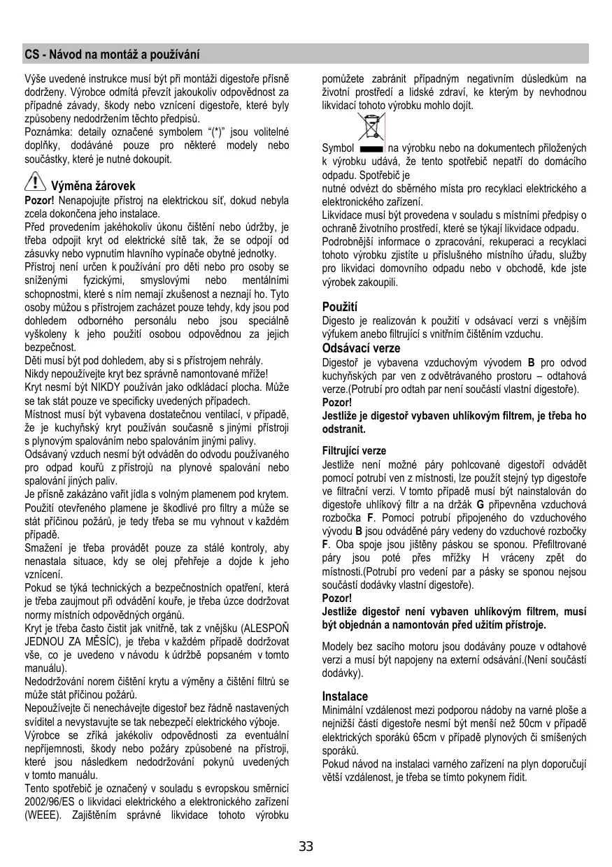 CS - Návod na montáž a používání Výše uvedené instrukce musí být při montáži digestoře přísně dodrženy. Výrobce odmítá převzít jakoukoliv odpovědnost za případné závady, škody nebo vznícení digestoře, které byly způsobeny nedodržením těchto předpisů. Poznámka: detaily označené symbolem “(*)” jsou volitelné doplňky, dodáváné pouze pro některé modely nebo součástky, které je nutné dokoupit. pomůžete zabránit případným negativním důsledkům na životní prostředí a lidské zdraví, ke kterým by nevhodnou likvidací tohoto výrobku mohlo dojít. na výrobku nebo na dokumentech přiložených Symbol k výrobku udává, že tento spotřebič nepatří do domácího odpadu. Spotřebič je nutné odvézt do sběrného místa pro recyklaci elektrického a elektronického zařízení. Likvidace musí být provedena v souladu s místními předpisy o ochraně životního prostředí, které se týkají likvidace odpadu. Podrobnější informace o zpracování, rekuperaci a recyklaci tohoto výrobku zjistíte u příslušného místního úřadu, služby pro likvidaci domovního odpadu nebo v obchodě, kde jste výrobek zakoupili. Výměna žárovek Pozor! Nenapojujte přístroj na elektrickou síť, dokud nebyla zcela dokončena jeho instalace. Před provedením jakéhokoliv úkonu čištění nebo údržby, je třeba odpojit kryt od elektrické sítě tak, že se odpojí od zásuvky nebo vypnutím hlavního vypínače obytné jednotky. Přístroj není určen k používání pro děti nebo pro osoby se sníženými fyzickými, smyslovými nebo mentálními schopnostmi, které s ním nemají zkušenost a neznají ho. Tyto osoby můžou s přístrojem zacházet pouze tehdy, kdy jsou pod dohledem odborného personálu nebo jsou speciálně vyškoleny k jeho použití osobou odpovědnou za jejich bezpečnost. Děti musí být pod dohledem, aby si s přístrojem nehrály. Nikdy nepoužívejte kryt bez správně namontované mříže! Kryt nesmí být NIKDY používán jako odkládací plocha. Může se tak stát pouze ve specificky uvedených případech. Místnost musí být vybavena dostatečnou ventilací, v případě, že je kuchyňský kryt používán současně s jinými přístroji s plynovým spalováním nebo spalováním jinými palivy. Odsávaný vzduch nesmí být odváděn do odvodu používaného pro odpad kouřů z přístrojů na plynové spalování nebo spalování jiných paliv. Je přísně zakázáno vařit jídla s volným plamenem pod krytem. Použití otevřeného plamene je škodlivé pro filtry a může se stát příčinou požárů, je tedy třeba se mu vyhnout v každém případě. Smažení je třeba provádět pouze za stálé kontroly, aby nenastala situace, kdy se olej přehřeje a dojde k jeho vznícení. Pokud se týká technických a bezpečnostních opatření, která je třeba zaujmout při odvádění kouře, je třeba úzce dodržovat normy místních odpovědných orgánů. Kryt je třeba často čistit jak vnitřně, tak z vnějšku (ALESPOŇ JEDNOU ZA MĚSÍC), je třeba v každém případě dodržovat vše, co je uvedeno v návodu k údržbě popsaném v tomto manuálu). Nedodržování norem čištění krytu a výměny a čištění filtrů se může stát příčinou požárů. Nepoužívejte či nenechávejte digestoř bez řádně nastavených svíditel a nevystavujte se tak nebezpečí elektrického výboje. Výrobce se zříká jakékoliv odpovědnosti za eventuální nepříjemnosti, škody nebo požáry způsobené na přístroji, které jsou následkem nedodržování pokynů uvedených v tomto manuálu. Tento spotřebič je označený v souladu s evropskou směrnicí 2002/96/ES o likvidaci elektrického a elektronického zařízení (WEEE). Zajištěním správné likvidace tohoto výrobku Použití Digesto je realizován k použití v odsávací verzi s vnějším výfukem anebo filtrující s vnitřním čištěním vzduchu. Odsávací verze Digestoř je vybavena vzduchovým vývodem B pro odvod kuchyňských par ven z odvětrávaného prostoru – odtahová verze.(Potrubí pro odtah par není součástí vlastní digestoře). Pozor! Jestliže je digestoř vybaven uhlíkovým filtrem, je třeba ho odstranit. Filtrující verze Jestliže není možné páry pohlcované digestoří odvádět pomocí potrubí ven z místnosti, lze použít stejný typ digestoře ve filtrační verzi. V tomto případě musí být nainstalován do digestoře uhlíkový filtr a na držák G připevněna vzduchová rozbočka F. Pomocí potrubí připojeného do vzduchového vývodu B jsou odváděné páry vedeny do vzduchové rozbočky F. Oba spoje jsou jištěny páskou se sponou. Přefiltrované páry jsou poté přes mřížky H vráceny zpět do místnosti.(Potrubí pro vedení par a pásky se sponou nejsou součástí dodávky vlastní digestoře). Pozor! Jestliže digestoř není vybaven uhlíkovým filtrem, musí být objednán a namontován před užitím přístroje. Modely bez sacího motoru jsou dodávány pouze v odtahové verzi a musí být napojeny na externí odsávání.(Není součástí dodávky). Instalace Minimální vzdálenost mezi podporou nádoby na varné ploše a nejnižší částí digestoře nesmí být menší než 50cm v případě elektrických sporáků 65cm v případě plynových či smíšených sporáků. Pokud návod na instalaci varného zařízení na plyn doporučují větší vzdálenost, je třeba se tímto pokynem řídit.