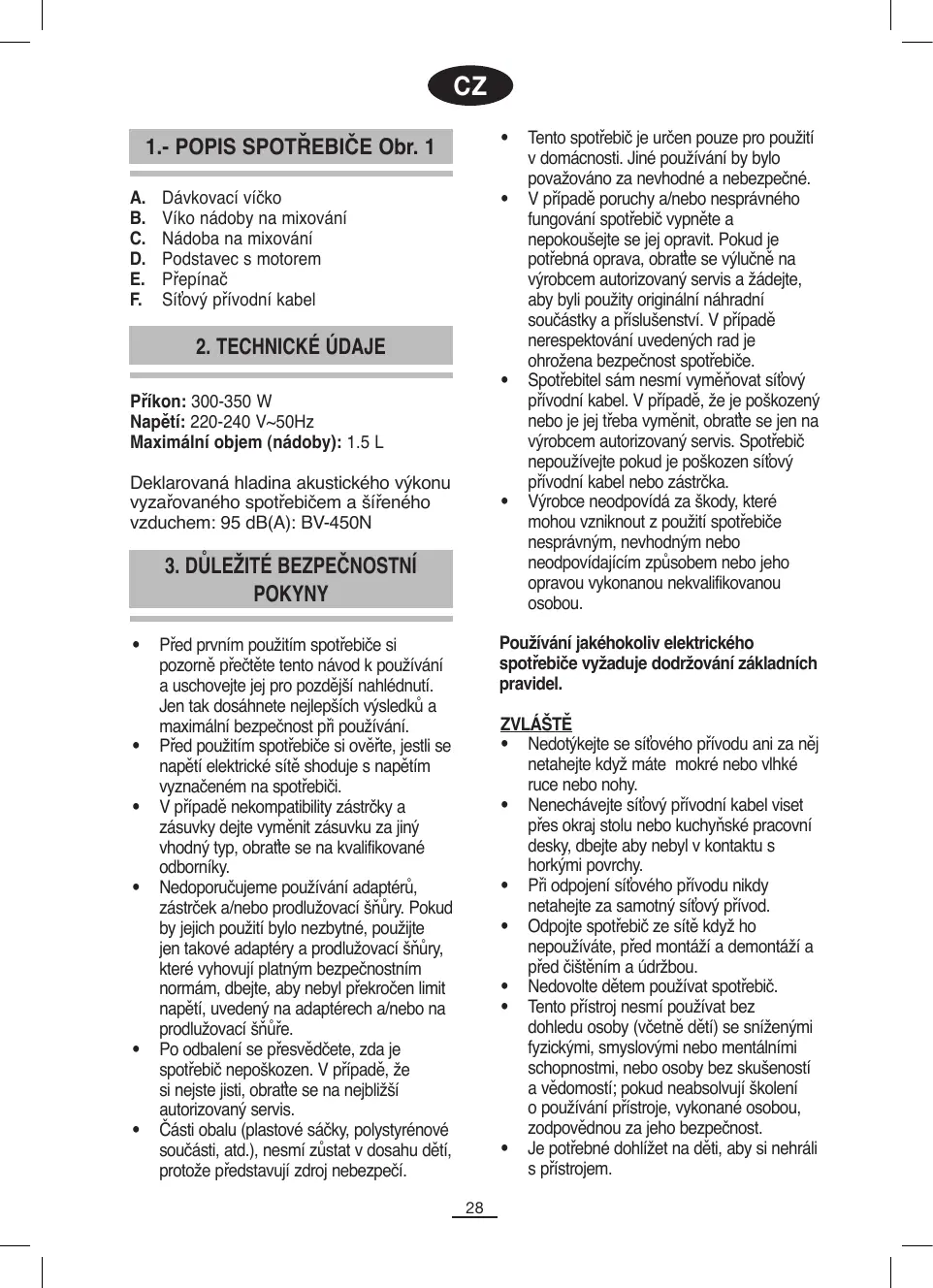 Příkon: 300-350 W Napětí: 220-240 V~50Hz Maximální objem (nádoby): 1.5 L Deklarovaná hladina akustického výkonu vyzařovaného spotřebičem a šířeného vzduchem: 95 dB(A): BV-450N