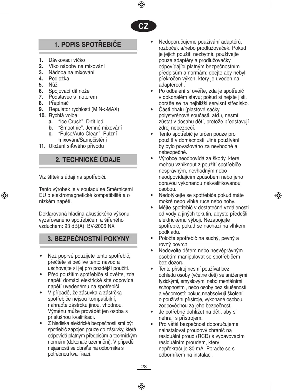 Nenechávejte zapnutý spotřebič bez dozoru, protože může být zdrojem nebezpečí. Při odpojení síťového přívodu nikdy netahejte za samotný přívod. Odpojte spotřebič ze sítě před každou operací související s čištěním nebo údržbou. Pokud dojde k poruše a/nebo nesprávnému fungování spotřebiče, vypněte jej a nepokoušejte se jej opravit. Pokud je nutná oprava, obraťte se výhradně na výrobcem autorizovaný servis a žádejte, aby byli použity originální náhradní díly a příslušenství. V případě, že je síťový přívod poškozen nebo je třeba ho vyměnit, obraťte se na výrobcem autorizovaný servis. Nevystavujte spotřebič atmosférickým vlivům (déšť, slunce, led, a pod.). Nepoužívejte spotřebič ani žádnou jeho část na teplém povrchu ani v blízkosti teplých povrchù, ani jej na ně neklaďte (plynové nebo elektrické hořáky, nebo trouby). Na čištění spotřebiče nepoužívejte abrazivní (drsné) čistící prostředky, hubky nebo hadříky. Nůž je velmi ostrý, nakládejte s ním opatrně, abyste se nepořezali. Nenaplňujte nádobu víc než po značku maximum. Nesejměte nádobu z podstavce dokud je mixér v chodu. Vždy používejte mixér se správně nasazeným víkem nádoby. Nevkládejte ruce ani žádné předměty do nádoby dokud je mixér v chodu. Pokud je to potřebné, mixér vypojte a použijte stěrku na odstranění potravin přilepených na stěnách nádoby. Podstavec s motorem neponořujte do vody ani do žádné jiné tekutiny. Nedotýkejte se nože dokud je spotřebič v chodu; vždy počkejte, dokud se nůž zastaví. Nepoužívejte tento spotřebič na jiné účely, než na zpracování potravin.