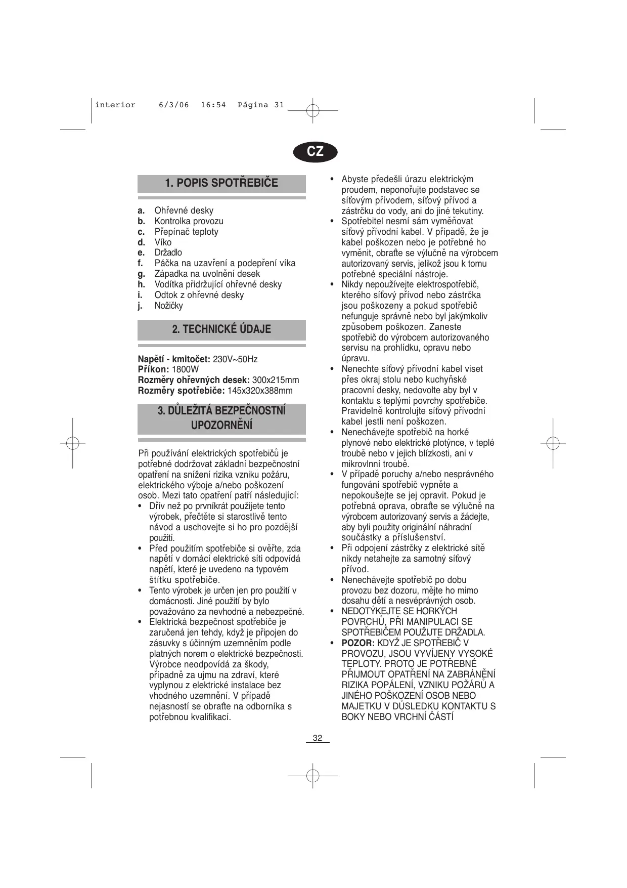 Napětí - kmitočet: 230V~50Hz Příkon: 1800W Rozměry ohřevných desek: 300x215mm Rozměry spotřebiče: 145x320x388mm