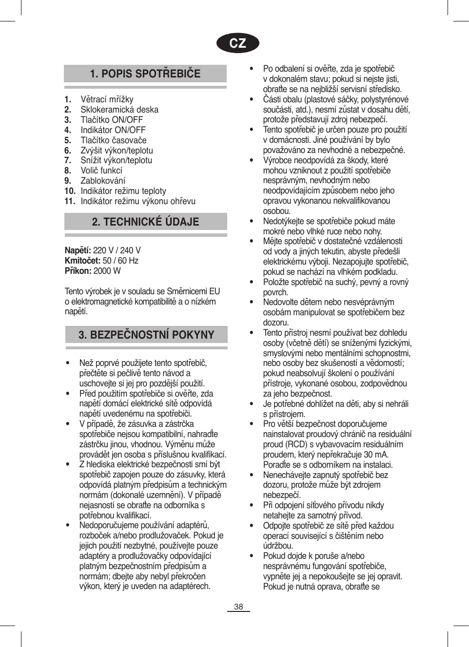 Napětí: 220 V / 240 V Kmitočet: 50 / 60 Hz Příkon: 2000 W