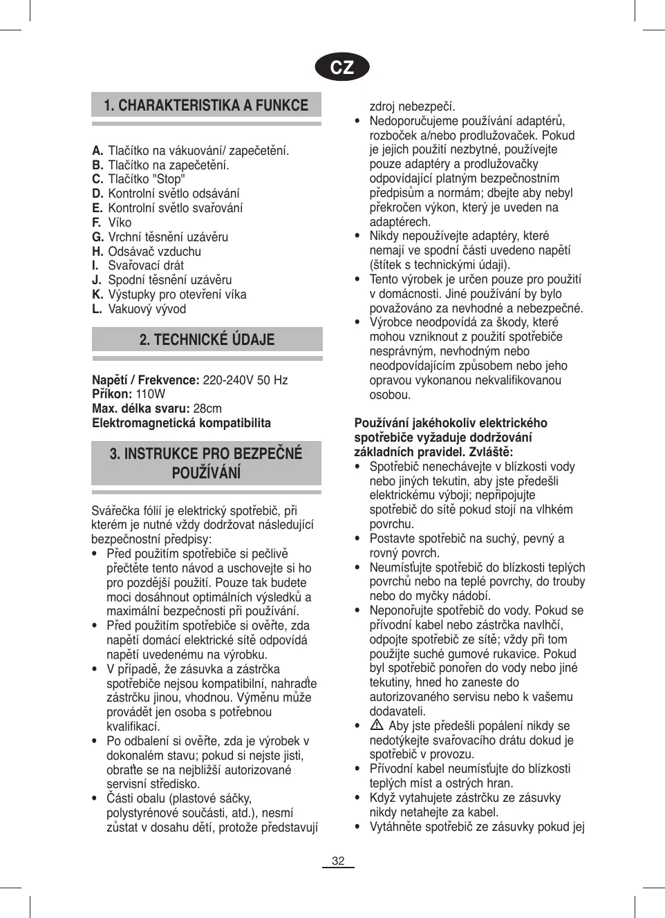 3. INSTRUKCE PRO BEZPEČNÉ POUŽÍVÁNÍ Svářečka fólií je elektrický spotřebič, při kterém je nutné vždy dodržovat následující bezpečnostní předpisy: • Před použitím spotřebiče si pečlivě přečtěte tento návod a uschovejte si ho pro pozdější použití. Pouze tak budete moci dosáhnout optimálních výsledků a maximální bezpečnosti při používání. • Před použitím spotřebiče si ověřte, zda napětí domácí elektrické sítě odpovídá napětí uvedenému na výrobku. • V případě, že zásuvka a zástrčka spotřebiče nejsou kompatibilní, nahraďte zástrčku jinou, vhodnou. Výměnu může provádět jen osoba s potřebnou kvalifikací. • Po odbalení si ověřte, zda je výrobek v dokonalém stavu; pokud si nejste jisti, obraťte se na nejbližší autorizované servisní středisko. • Části obalu (plastové sáčky, polystyrénové součásti, atd.), nesmí zůstat v dosahu dětí, protože představují 32