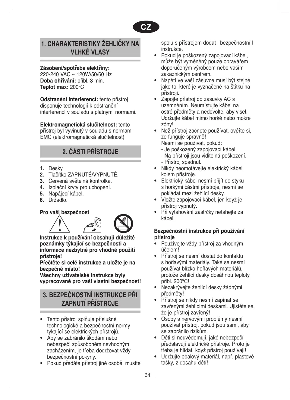 spolu s přístrojem dodat i bezpečnostní I instrukce. Pokud je poškozený zapojovací kábel, může být vyměněný pouze opravářem doporučeným výrobcem nebo vaším zákaznickým centrem. Napětí ve vaší zásuvce musí být stejné jako to, které je vyznačené na štítku na přístroji. Zapojte přístroj do zásuvky AC s uzemněním. Neumísťujte kábel na ostré předměty a nedovolte, aby visel. Udržujte kábel mimo horké nebo mokré zóny! Než přístroj začnete používat, ověřte si, že funguje správně! Nesmí se používat, pokud: - Je poškozený zapojovací kábel. - Na přístroji jsou viditelná poškození. - Přístroj spadnul. Nikdy neomotávejte elektrický kábel kolem přístroje. Elektrický kábel nesmí přijít do styku s horkými částmi přístroje, nesmí se pokládat mezi žehlící desky. Vložte zapojovací kábel, jen když je přístroj vypnutý. Při vytahování zástrčky netahejte za kábel. Bezpečnostní instrukce při používání přístroje