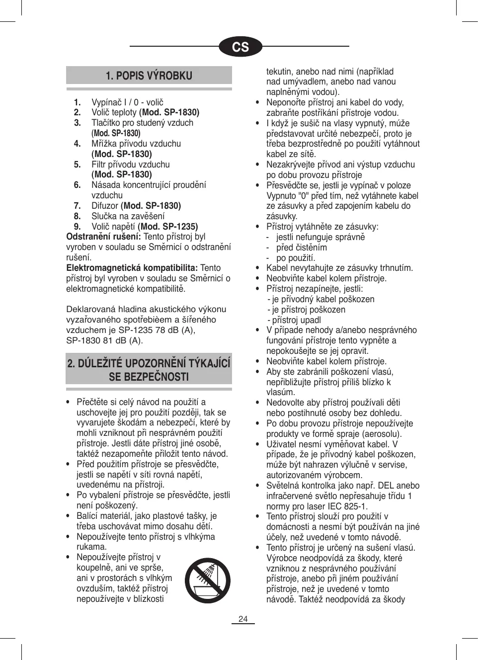 - Nepoužívejte prístroj v koupelné, ani ve sprěse, ani v prostorách s vlhkým ovdusím, taktéž prístroj nepoužívejte v blízkosti