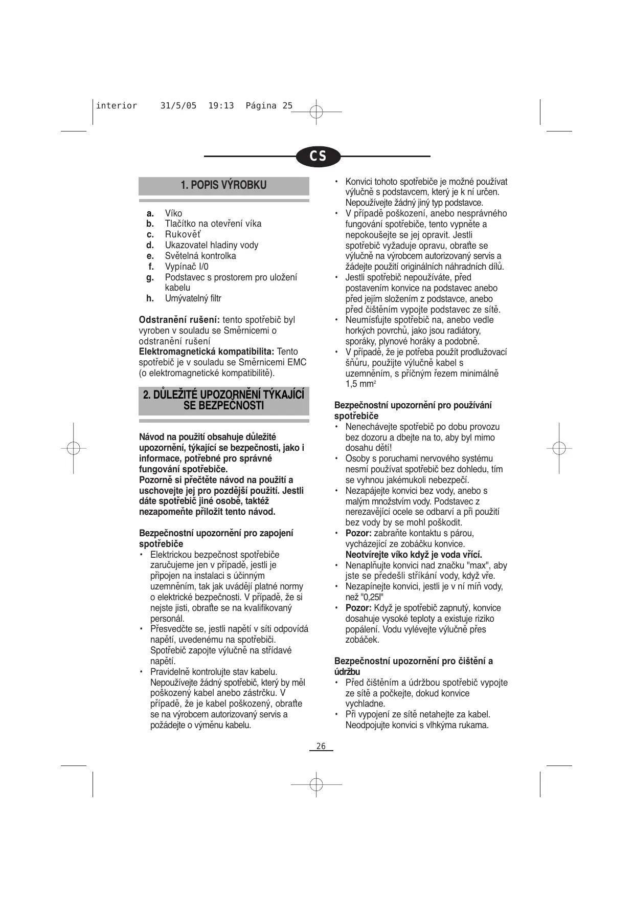 interior 31/5/05 19:13 Página 26 (8). Konvici můžete kdykoli vypnout vypínačem I/0 "f". Poznámka: Konvice se taky vypne když ji zvednete z podstavce.