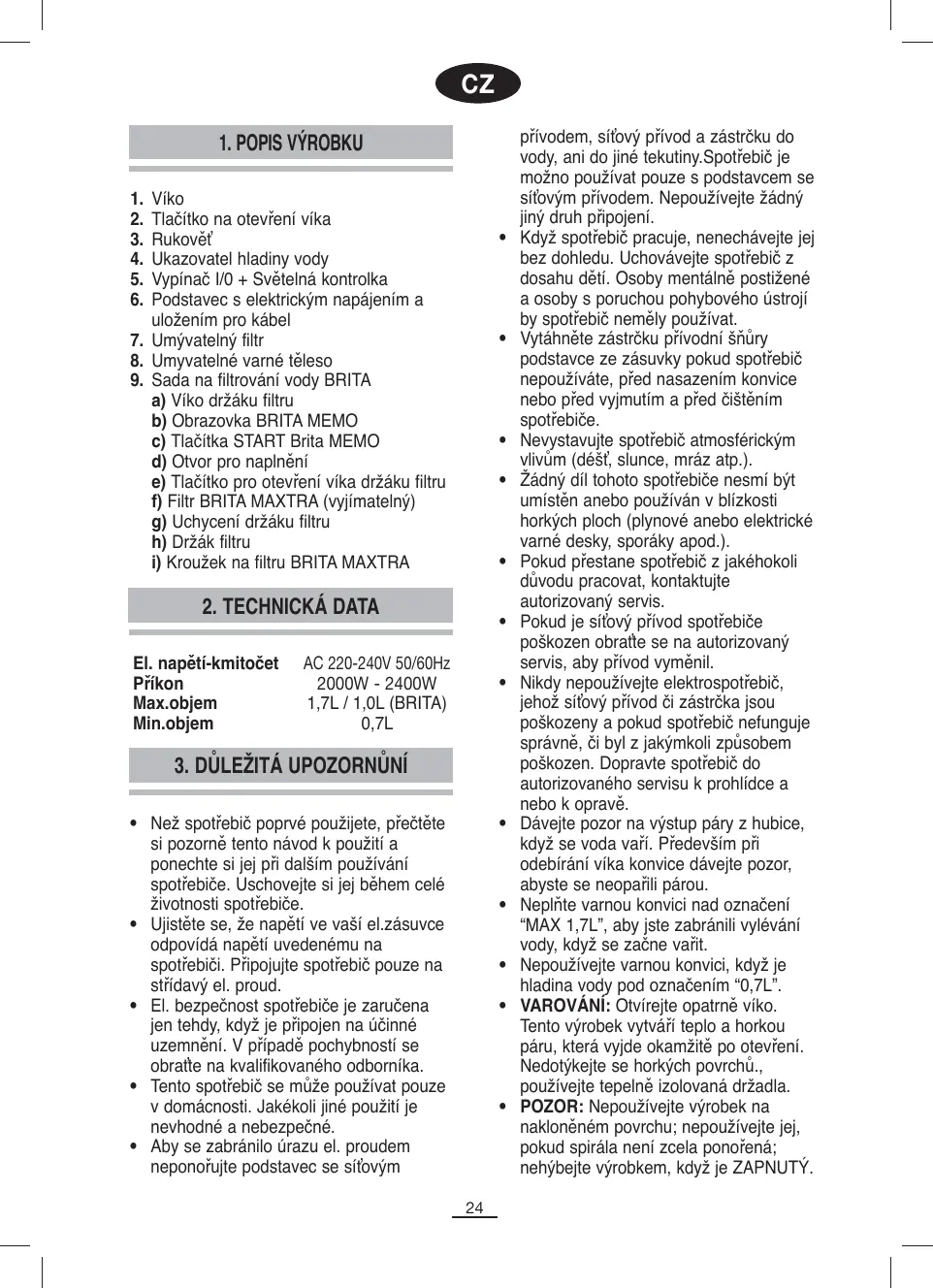 přívodem, síťový přívod a zástrčku do vody, ani do jiné tekutiny.Spotřebič je možno používat pouze s podstavcem se síťovým přívodem. Nepoužívejte žádný jiný druh připojení. Když spotřebič pracuje, nenechávejte jej bez dohledu. Uchovávejte spotřebič z dosahu dětí. Osoby mentálně postižené a osoby s poruchou pohybového ústrojí by spotřebič neměly používat. Vytáhněte zástrčku přívodní šňůry podstavce ze zásuvky pokud spotřebič nepoužíváte, před nasazením konvice nebo před vyjmutím a před čištěním spotřebiče. Nevystavujte spotřebič atmosférickým vlivům (déšť, slunce, mráz atp.). Žádný díl tohoto spotřebiče nesmí být umístěn anebo používán v blízkosti horkých ploch (plynové anebo elektrické varné desky, sporáky apod.). Pokud přestane spotřebič z jakéhokoli důvodu pracovat, kontaktujte autorizovaný servis. Pokud je síťový přívod spotřebiče poškozen obraťte se na autorizovaný servis, aby přívod vyměnil. Nikdy nepoužívejte elektrospotřebič, jehož síťový přívod či zástrčka jsou poškozeny a pokud spotřebič nefunguje správně, či byl z jakýmkoli způsobem poškozen. Dopravte spotřebič do autorizovaného servisu k prohlídce a nebo k opravě. Dávejte pozor na výstup páry z hubice, když se voda vaří. Především při odebírání víka konvice dávejte pozor, abyste se neopařili párou. Neplňte varnou konvici nad označení “MAX 1,7L”, aby jste zabránili vylévání vody, když se začne vařit. Nepoužívejte varnou konvici, když je hladina vody pod označením “0,7L”. VAROVÁNÍ: Otvírejte opatrně víko. Tento výrobek vytváří teplo a horkou páru, která vyjde okamžitě po otevření. Nedotýkejte se horkých povrchů., používejte tepelně izolovaná držadla. POZOR: Nepoužívejte výrobek na nakloněném povrchu; nepoužívejte jej, pokud spirála není zcela ponořená; nehýbejte výrobkem, když je ZAPNUTÝ.