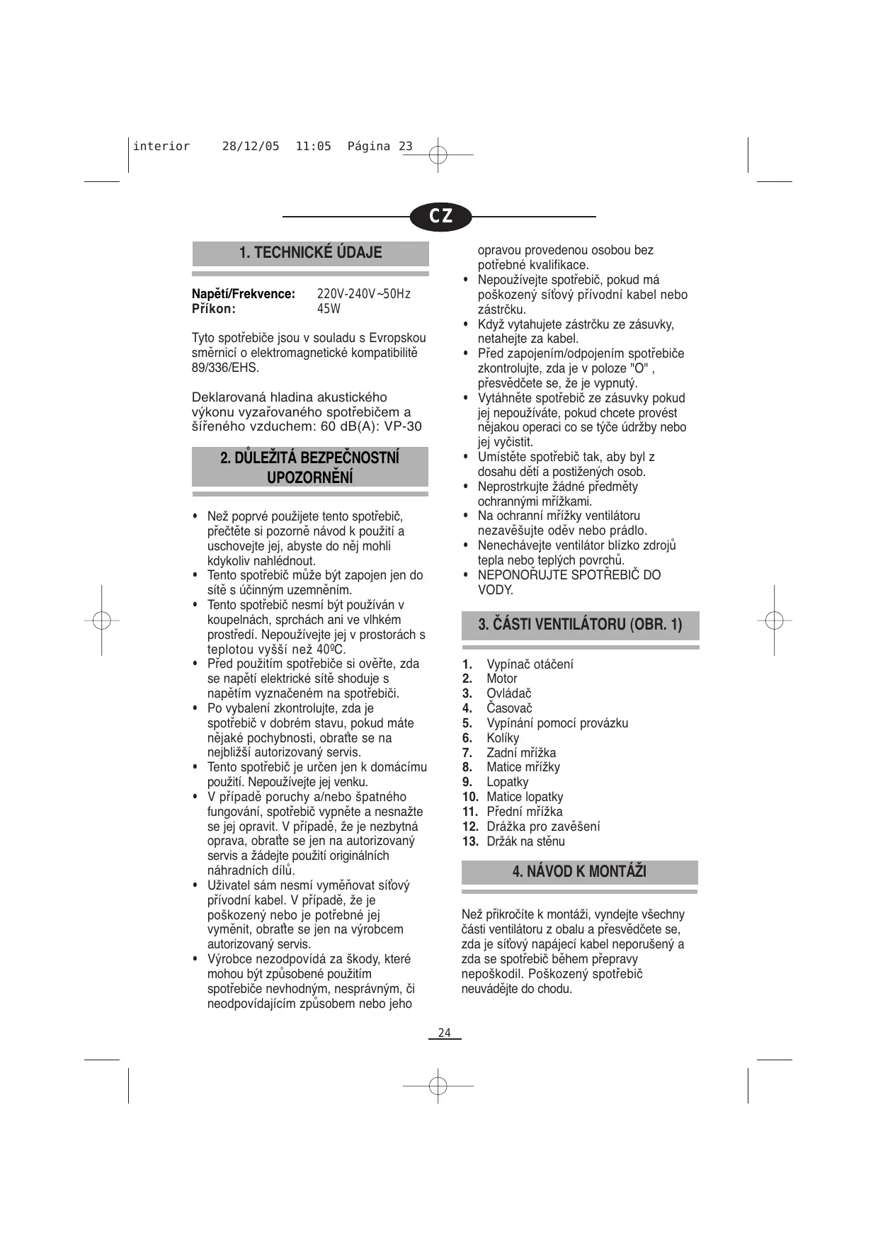 Napëti/Frekvence: 220V-240V-50Hz Piikon: 45wW Tyto spotiebiée jsou v souladu s Evropskou smérnici o elektromagnetické kompatibilité 89/336/EHS. Deklarovanä hladina akustického vÿkonu vyzaïovaného spotiebiéem a &ifeného vzduchem: 60 dB(A): VP-30