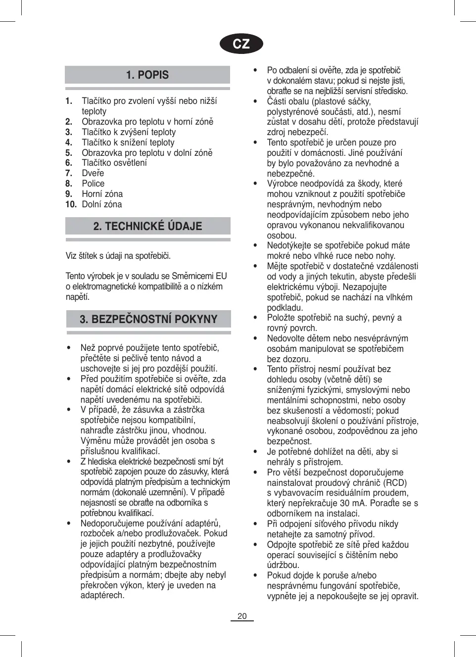 Po odbalení si ověřte, zda je spotřebič v dokonalém stavu; pokud si nejste jisti, obraťte se na nejbližší servisní středisko. Části obalu (plastové sáčky, polystyrénové součásti, atd.), nesmí zůstat v dosahu dětí, protože představují zdroj nebezpečí. Tento spotřebič je určen pouze pro použití v domácnosti. Jiné používání by bylo považováno za nevhodné a nebezpečné. Výrobce neodpovídá za škody, které mohou vzniknout z použití spotřebiče nesprávným, nevhodným nebo neodpovídajícím způsobem nebo jeho opravou vykonanou nekvalifikovanou osobou. Nedotýkejte se spotřebiče pokud máte mokré nebo vlhké ruce nebo nohy. Mějte spotřebič v dostatečné vzdálenosti od vody a jiných tekutin, abyste předešli elektrickému výboji. Nezapojujte spotřebič, pokud se nachází na vlhkém podkladu. Položte spotřebič na suchý, pevný a rovný povrch. Nedovolte dětem nebo nesvéprávným osobám manipulovat se spotřebičem bez dozoru. Tento přístroj nesmí používat bez dohledu osoby (včetně dětí) se sníženými fyzickými, smyslovými nebo mentálními schopnostmi, nebo osoby bez skušeností a vědomostí; pokud neabsolvují školení o používání přístroje, vykonané osobou, zodpovědnou za jeho bezpečnost. Je potřebné dohlížet na děti, aby si nehrály s přístrojem. Pro větší bezpečnost doporučujeme nainstalovat proudový chránič (RCD) s vybavovacím residuálním proudem, který nepřekračuje 30 mA. Poraďte se s odborníkem na instalaci. Při odpojení síťového přívodu nikdy netahejte za samotný přívod. Odpojte spotřebič ze sítě před každou operací související s čištěním nebo údržbou. Pokud dojde k poruše a/nebo nesprávnému fungování spotřebiče, vypněte jej a nepokoušejte se jej opravit.