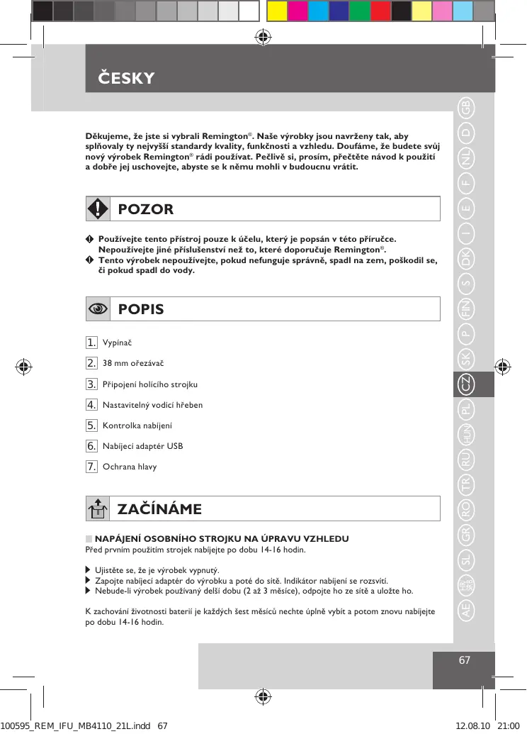 DK I POZOR E F Děkujeme, že jste si vybrali Remington®. Naše výrobky jsou navrženy tak, aby splňovaly ty nejvyšší standardy kvality, funkčnosti a vzhledu. Doufáme, že budete svůj nový výrobek Remington® rádi používat. Pečlivě si, prosím, přečtěte návod k použití a dobře jej uschovejte, abyste se k němu mohli v budoucnu vrátit.