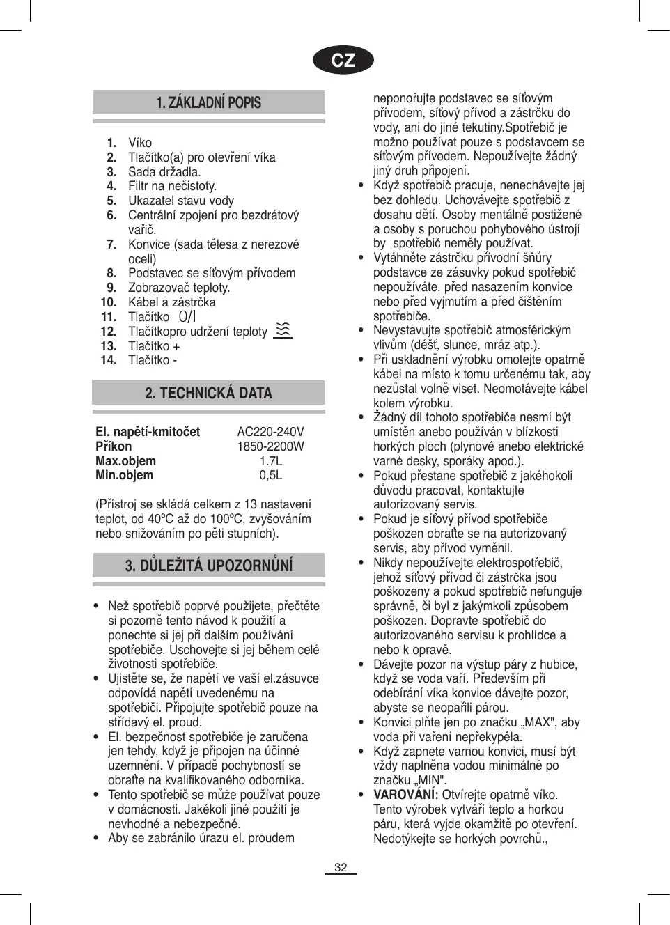 Débranchez la base de branchement de la prise du secteur lorsque vous ne l’utilisez pas, avant de mettre en place ou d’enlever la bouilloire ou avant de procéder à son nettoyage. Avant de ranger la bouilloire, veillez à bien enrouler le cordon autour de l’enrouleur. Ne jamais enrouler le cordon autour du corps de la bouilloire. N’exposez pas l’appareil aux agents atmosphériques (pluie, soleil, gel, etc.) N’utilisez ou ne posez aucune partie de cet appareil sur des surfaces chaudes ou près de celles-ci (plaques de cuisson, fours, etc.) Si l’appareil cesse de fonctionner, adressez-vous uniquement à un centre d’assistance technique agréé. Si le cordon de cet appareil est endommagé, adressez-vous à un Centre d’Assistance technique agréé pour le remplacer. N’utilisez aucun appareil électrique si le cordon ou la fiche est endommagé(e), ou si l’appareil ne fonctionne pas comme il faut ou encore s’il a été endommagé d’une façon ou d’une autre. Adressezvous à un centre d’assistance technique agréé pour l’examiner, le réparer ou le régler. Evitez le contact avec la vapeur provenant du bec verseur lorsque l’eau bout. Veillez surtout à ne pas vous brûler en retirant le couvercle de la bouilloire. Ne remplissez pas la bouilloire au-delà de l’indication « MAXI », afin d’éviter que