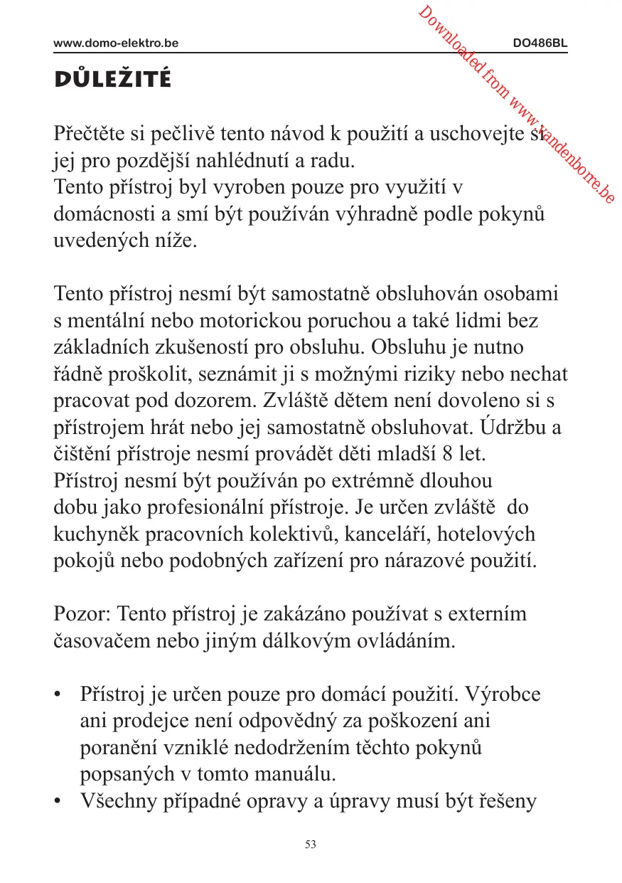 Tento prístroj nesmi byt samostatné obsluhován osobami s mentalní nebo motorickou poruchou a také lidmi bez základních zkušeností pro obsluhu. Obsluhu je nutno rákne proškolit, seznámit ji s možnými rizíky nebo nechat pracovat pod dozorem. Zvlástě dětem není dovoleno si s prístrojem hrát nebo jej samostatné obsluhovat. Údržbu a Čištěné prístroje nesmi provádet děti mladů 8 let.